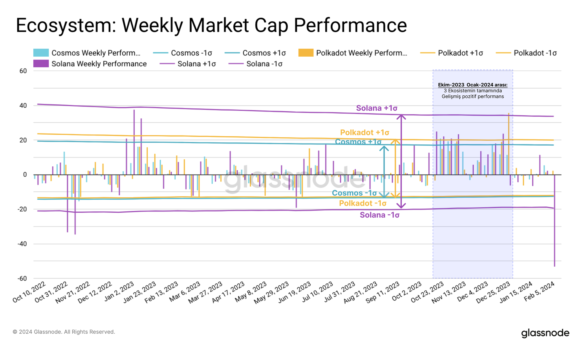 Şimdi, her bir ekosistemdeki kripto paranın toplam piyasa değerindeki haftalık değişimi karşılaştırıyoruz. Geçtiğimiz 18 ay boyunca Solana nispeten yüksek bir volatilite sergilemiş ve yukarı yönlü performansıyla dikkat çekmiştir. Polkadot ve Cosmos benzer dalgalanmalara sahiptir, ancak Polkadot ekosistemi ikincisinden daha iyi performans göstermektedir.
