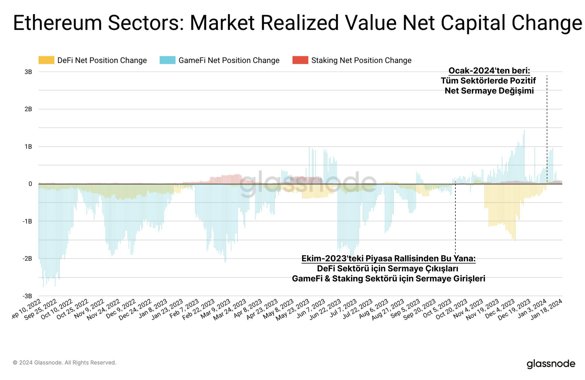 Ethereum ekosistemi içinde üç ana sektör olduğunu söyleyebiliriz: DeFi, GameFi ve Staking. Bu yılın başından bu yana, her üç sektörde de sermaye girişleri görüldü, ancak DeFi ve GameFi sektörleri 2022 ve 2023 boyunca nispeten büyük sermaye çıkışlarına uğradı.