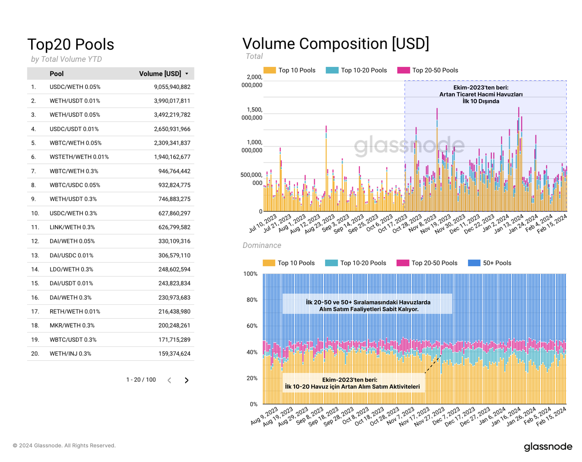 Şimdi bunu, Ekim 2023'ten bu yana, İlk 10'un dışındaki tokenler de dahil olmak üzere Uniswap'teki ticaret hacminde bir artış gözlemleyebildiğimiz tüccarların davranışlarıyla karşılaştırıyoruz. İlk 10 ila 20 token çifti için ticaret faaliyeti de artıyor.