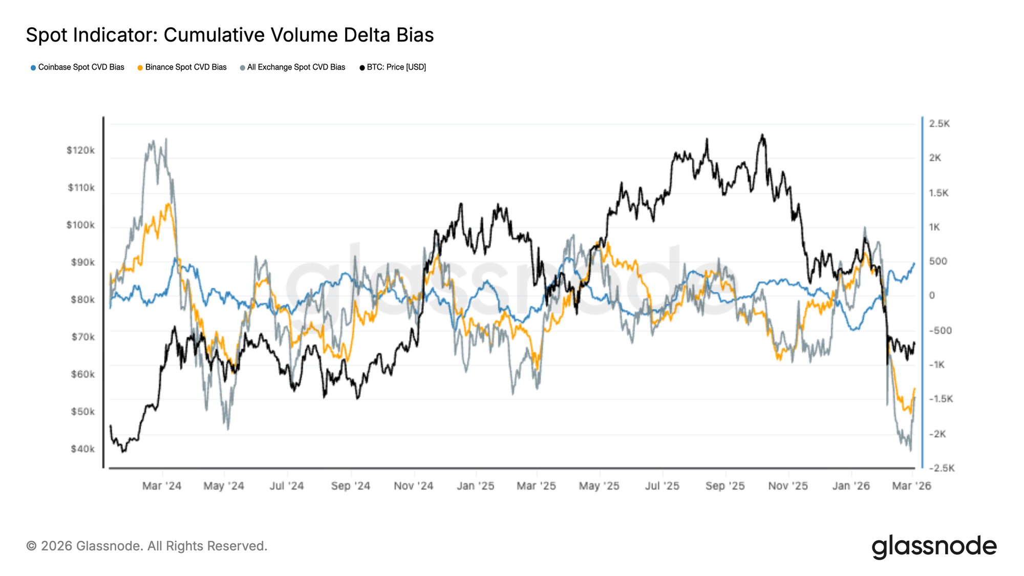 Spot piyasalarda yakın zamanda satıcıların baskın olduğu sert bir dalga yaşandı. Büyük borsalardaki Kümülatif Hacim Deltası (CVD), agresif piyasa satış emirlerinin son fiyat düşüşünü tetiklemesiyle derin negatif bölgelere geriledi.