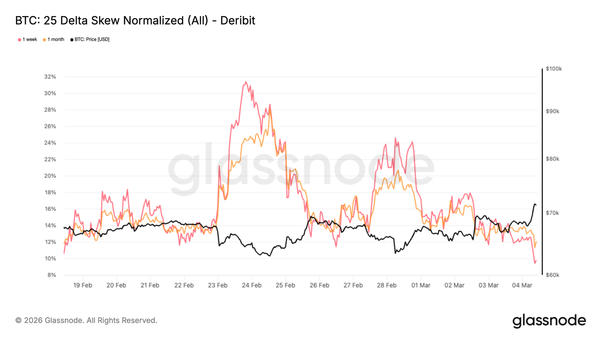 Skew, Şubat ayındaki satış dalgasında görülen uç seviyelerden belirgin şekilde geriledi. Grafiğin de gösterdiği gibi, son iki haftadır BTC fiyatındaki her düşüş hareketi opsiyon piyasasında giderek daha ılımlı bir tepkiyle karşılandı. Yatırımcılar aşağı yönlü korunma talebinde çok daha az agresif davranarak skew'i kademeli olarak aşağı çekti. Satışın zirve yaptığı dönemde, yatırımcılar daha fazla düşüşe karşı hedge yapmak için adeta yarışırken put talebi fırlamış ve skew'i derin put bölgesine itmişti. Bu aciliyet hissi açıkça ortadan kalktı.