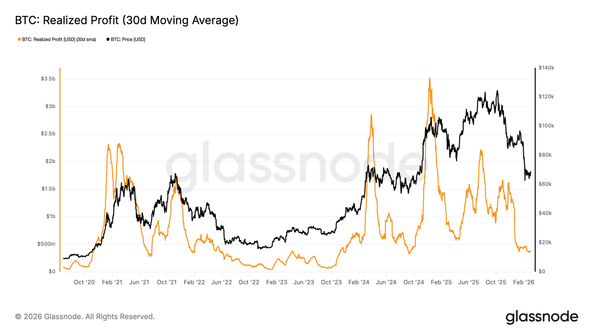 Şubat başından bu yana Bitcoin, 70 bin doların üzerinde haftalık kapanış yapmayı başaramadı ve bu bölgeyi kısa vadeli direnç haline getirdi. Bu fiyat reddinin talepte gerçek bir bozulmayı yansıtıp yansıtmadığını değerlendirmek için, zincir içi katılımcıların coin'lerini harcarken kilitledikleri dolar bazlı kârı toplayan ve kısa vadeli gürültüyü filtreleyen 30 günlük Basit Hareketli Ortalama (30D-SMA) Gerçekleşen Kâr metriğine bakıyoruz.