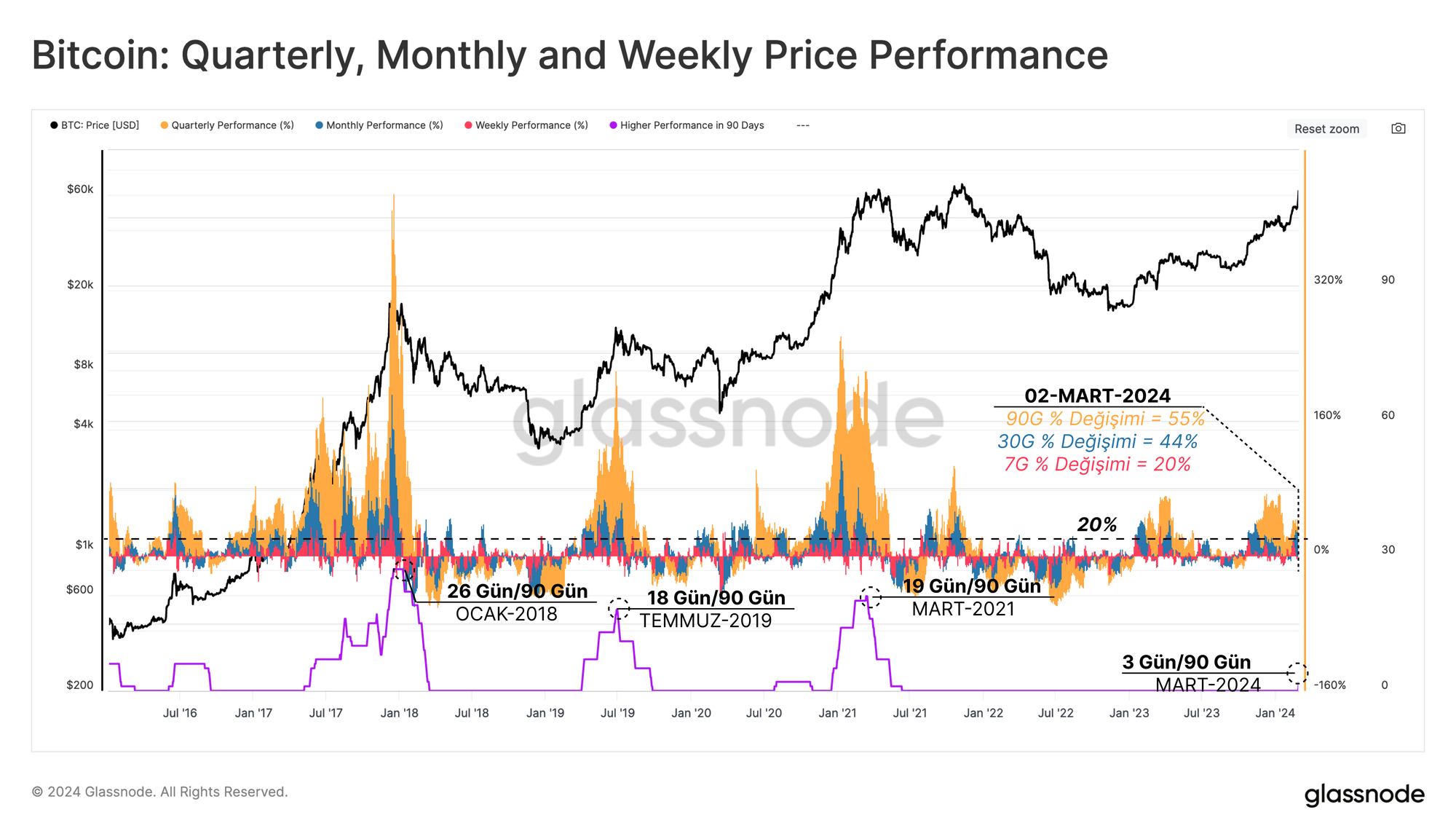 Aşağıdaki grafik Haftalık 🟥, Aylık 🟦 ve Üç Aylık 🟧 zaman dilimlerinde performansı göstermektedir ve yazım sırasında sırayla +%20, +%44 ve +%55'e ulaşmıştır. Son çeyrekte her üç performans göstergesinin de +%20'yi aştığı işlem günlerinin sayısını sayarsak, geçen hafta sonundaki rallinin 2021 boğa piyasasından bu yana en güçlü ralli olduğunu görebiliriz.