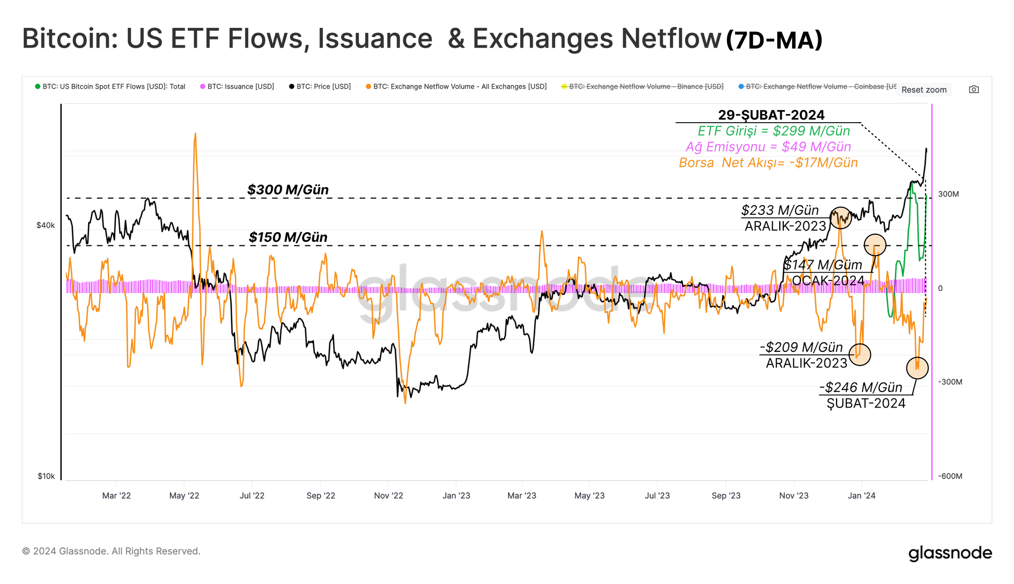 Genel olarak bu, Bitcoin'e günde yaklaşık 267 milyon dolarlık (-49+17+299) net sermaye girişini temsil etmektedir. Bu, piyasa dinamiklerinde anlamlı bir faz değişimini ve piyasanın yeni ATH'lere doğru ilerlemekte olduğu olarak açıklanabilir.
