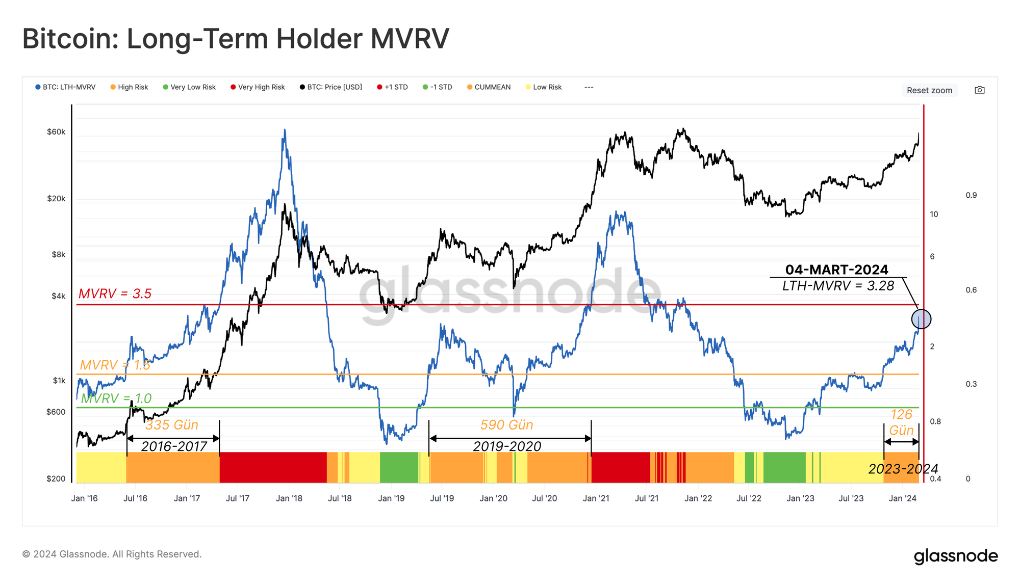 Fiyat ile maliyet esası arasındaki bir oran olan LTH-MVRV metriğini kullanarak uzun vadeli sahiplerin elinde tuttuğu gerçekleşmemiş kâr katsayısını çizebiliriz. Bu oran şu anda 3,28 seviyesinde işlem görmektedir ve tipik bir döngünün aşağıdaki aşamalarını ayıran tarihsel olarak önemli iki eşik seviyesi arasında yer almaktadır.
