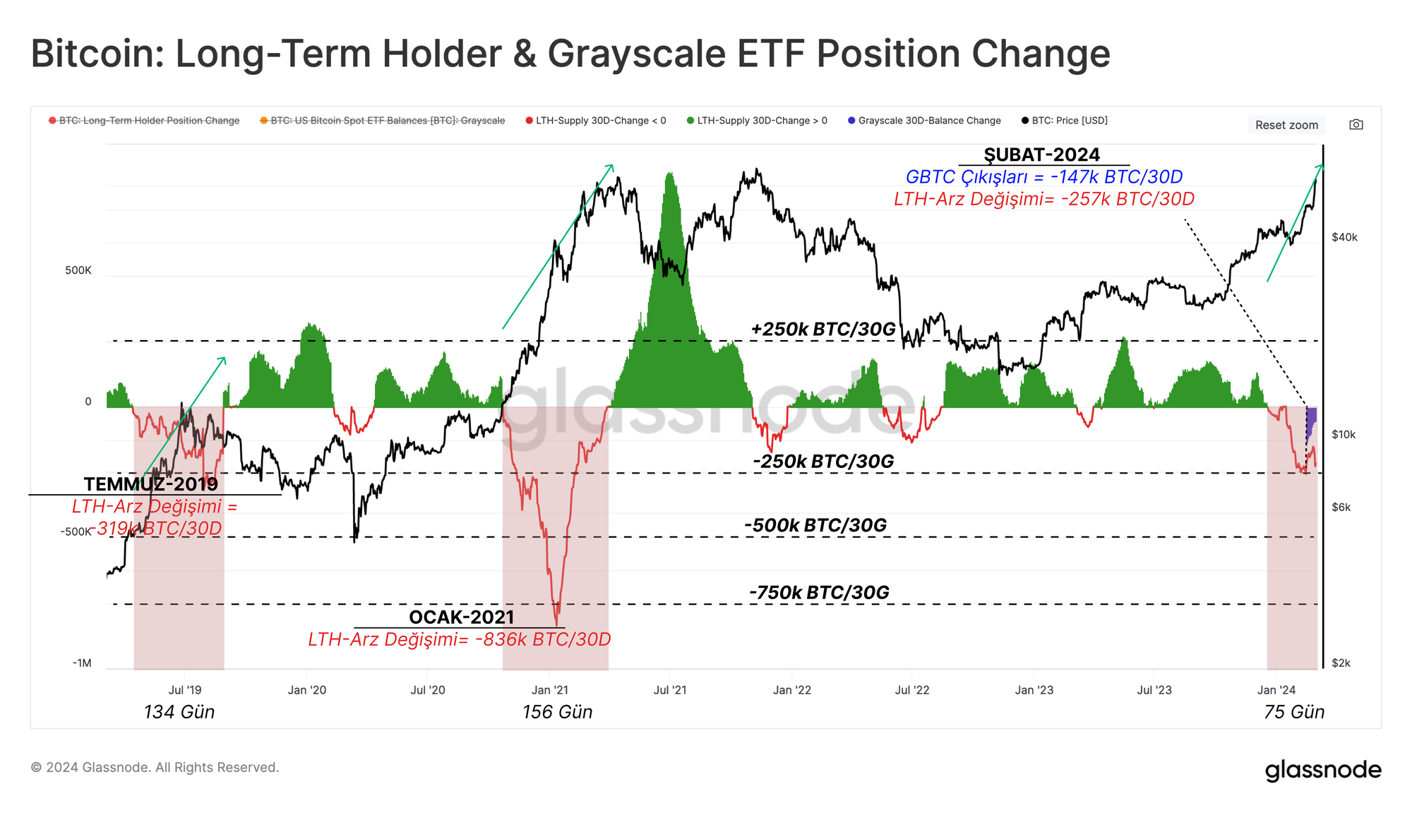 - Uzun Vadeli Yatırımcılar satış baskısını artırmaya başladı ve ayda 257 bin BTC'lik harcama oranlarına ulaştı; GBTC bu hacimlerin %57'sini oluşturuyor.