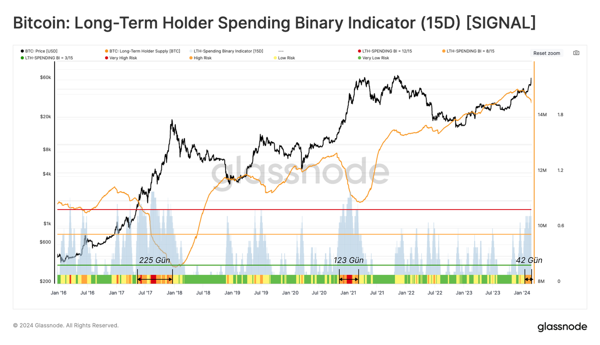 Bu araştırmanın son bölümünde, LTH harcamalarının 15 günlük sürekli bir dönem boyunca toplam bakiyelerini tüketmeye yetecek büyüklükte olduğu dönemleri tanımlayan ikili bir gösterge oluşturduk. Bu harcama, yeni talebi dengeleyerek bir karşı ağırlık görevi gören, uzun süredir uykuda olan arzın tekrar likit dolaşıma girmesini temsil etmektedir.