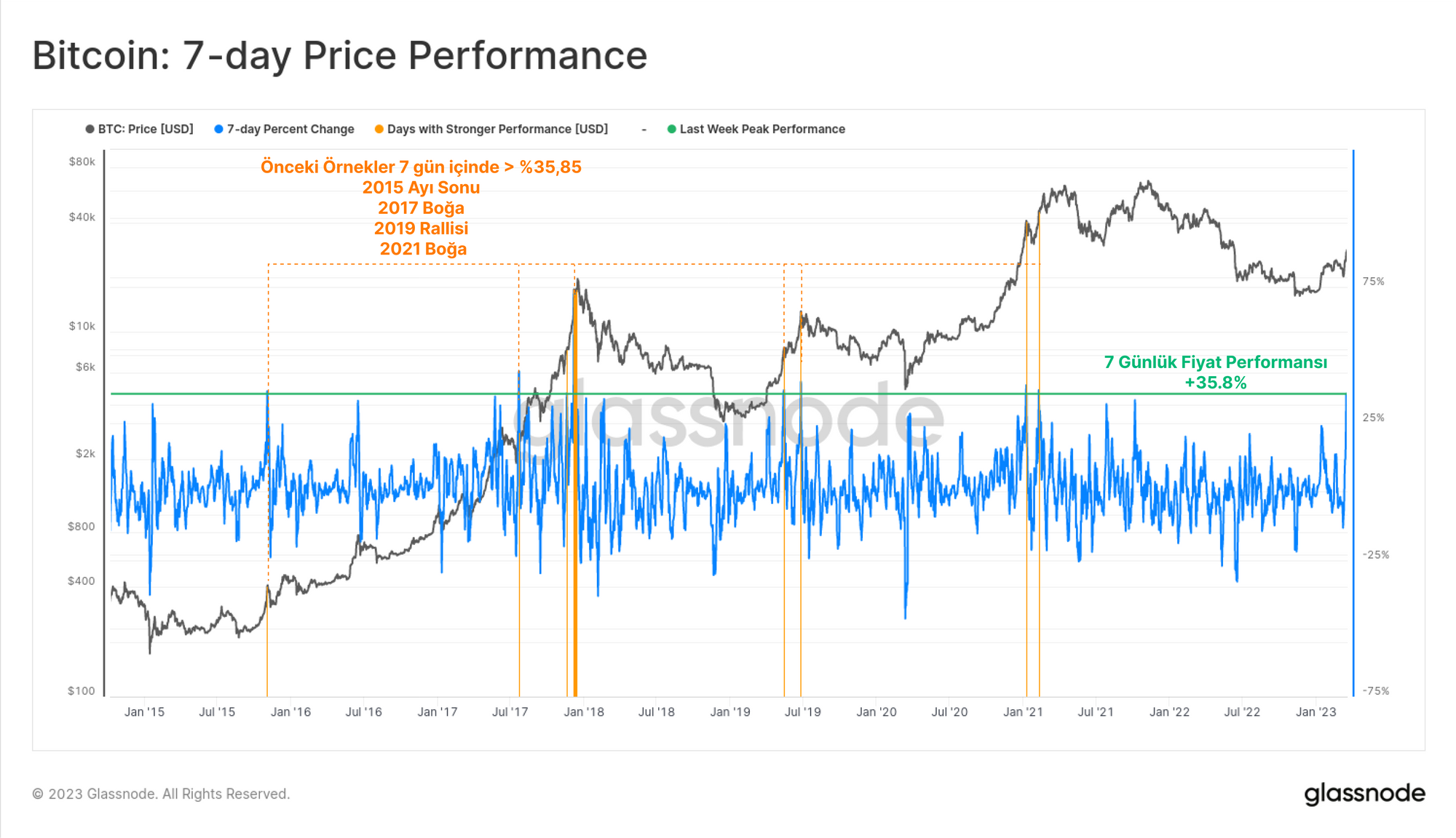 Bitcoin, haftayı %35,8 artışla kapatarak tarihin en iyi performans gösteren fiyat hareketlerinden birini yaşadı. Tarihte yalnızca 124 işlem gününde 7 günlük daha büyük bir yukarı yönlü ralli görüldü ve 2015'ten itibaren yalnızca 16 gün gerçekleşti. Neredeyse tüm örnekler boğa piyasası trendleri içinde gerçekleşmiş olsa da, tipik olarak rallinin son aşamalarına yakındır.