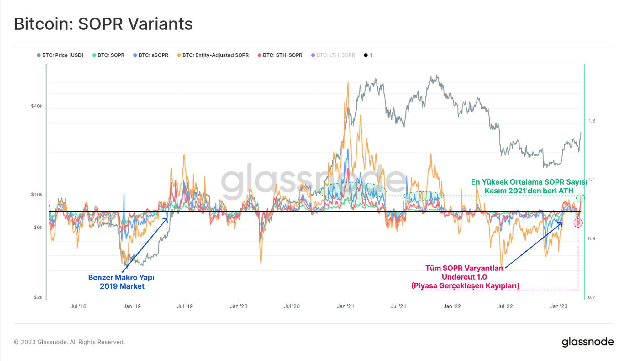 2018-19 döngüsüne benzer bir toparlanma yapısının şu anda devam ettiğini not ediyoruz. Geçen hafta tüm SOPR varyantlarının 1,0 seviyesinin altına düşmesiyle sağlıklı bir 'yıkım' olayı gerçekleşti. Bu, 19,8 bin $'lık satış sırasında geniş çaplı bir gerçekleşen kayıp olayına işaret etmektedir.