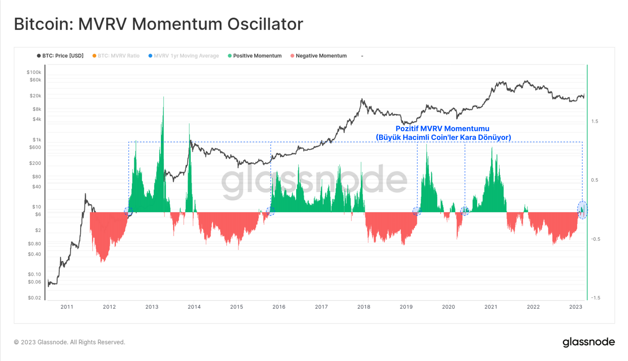 MVRV Momentum Osilatörü bu makro faz değişimlerini belirlemek için güçlü bir araçtır ve şu anda 0'ın üzerine çıkma sürecindedir. Bu gösterge, kripto para arzının büyük bir kısmının spot fiyatın üzerinde veya altında elde edildiği ve sırasıyla gerçekleşmemiş bir zararı veya karı tutmaya hızlı bir şekilde geri döndüğü olaylara çok duyarlıdır (yani yakın döngü bükülme noktaları).