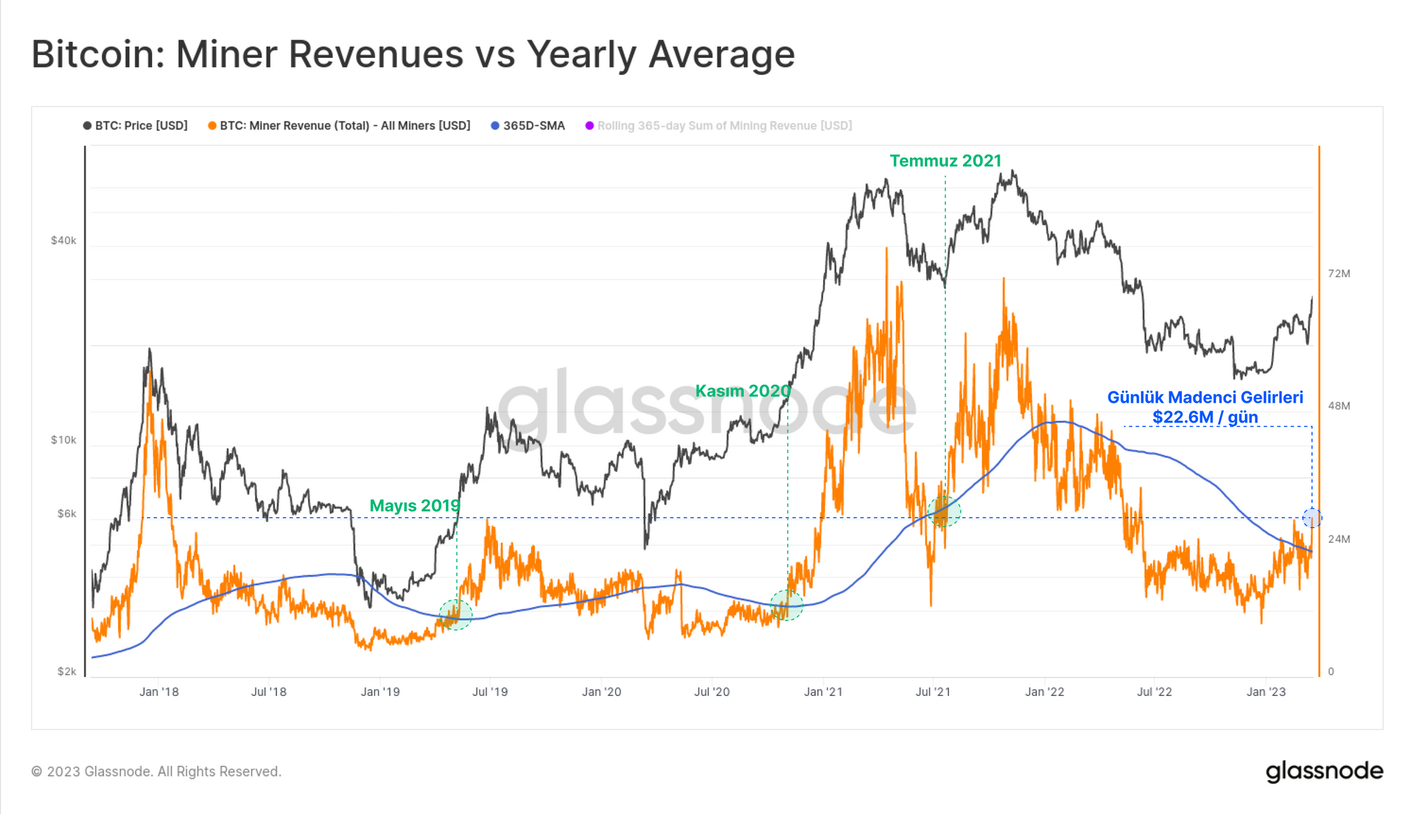 Madenciler, toplam gelirlerinin günlük 22,6 milyon dolara yükseldiğini görerek bu akının en önemli faydalanıcıları oldu. Bu hafta madenci gelirleri Haziran 2022'den bu yana en yüksek seviyeye çıkarak yıllık ortalamanın üzerine çıktı.