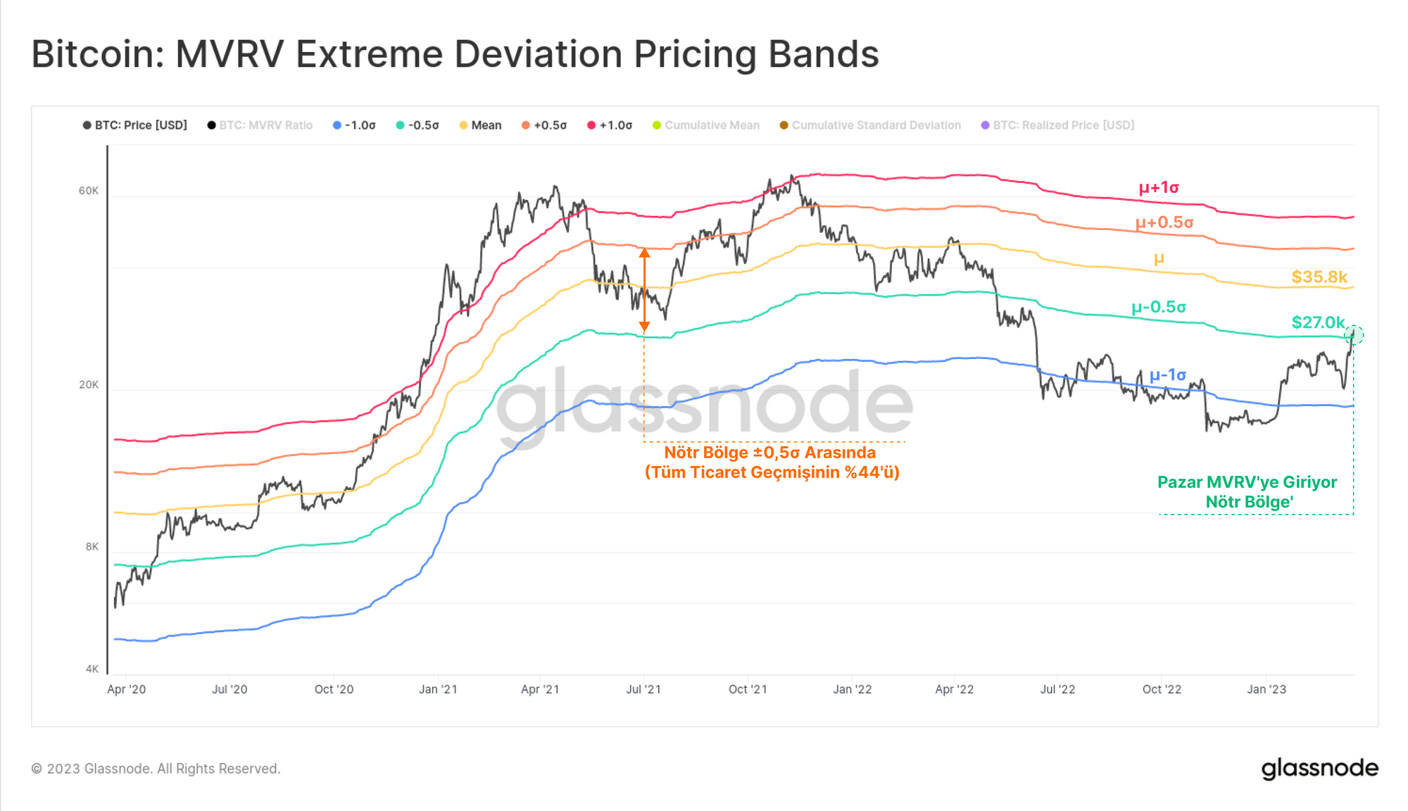 MVRV'nin Gerçekleşen Fiyattan türetilen bir oran olduğu göz önüne alındığında, bu önemli MVRV seviyelerine karşılık gelecek bir fiyatlandırma seviyesini hesaplayabiliriz. BTC fiyatlarının bu hafta 27 bin doların üzerine çıkmasıyla, piyasa şu anda uzun vadeli ortalamadan ±0,5 standart sapma nötr bölgesinde işlem görüyor.