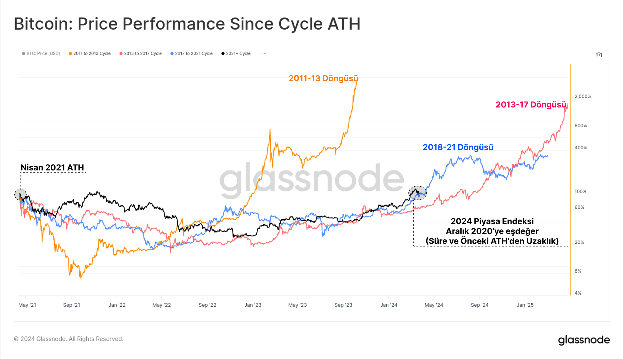 Nisan 2021 ATH'den (ayı piyasası algısının başladığını düşündüğümüz yer) bu yana fiyat performansını (siyah) endekslersek, önceki döngüyle (mavi) dikkate değer bir benzerlik görebiliriz. Hem süre hem de Nisan 2021 zirvesine olan mesafe açısından piyasa, 2018-21 döngüsüne kıyasla Aralık 2020 ile neredeyse aynı noktada bulunuyor.