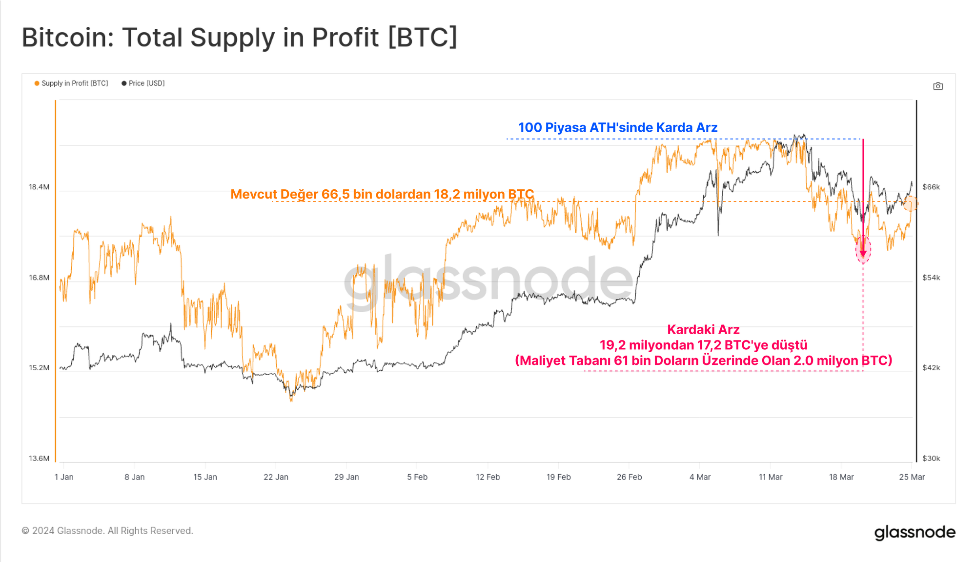 - Yaklaşık 1,0 milyon BTC, 66,5 bin $ ile 73,2 bin $'lık ATH arasında bir maliyete sahiptir.