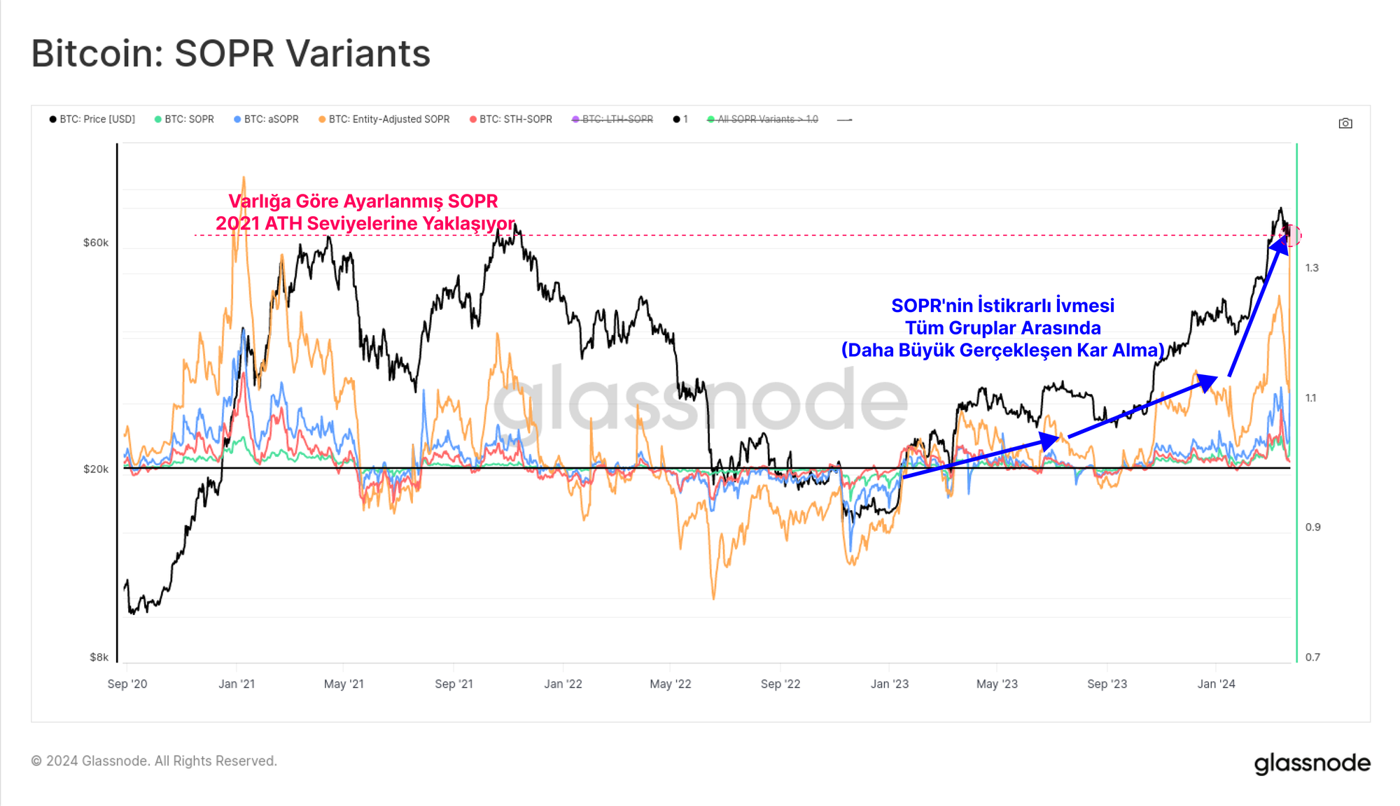 Şu anda 61,2 bin $'ın üzerinde bir maliyete sahip olan bu 2,0 milyon BTC'nin büyük bir kısmı yakın zamanda el değiştirmiş ve önceki sahibi bunları kârını realize etmek için satmıştır. Aşağıdaki grafik, bu gerçekleşen kâr davranışını tanımlayan SOPR metriği için bir dizi varyant sunmaktadır.