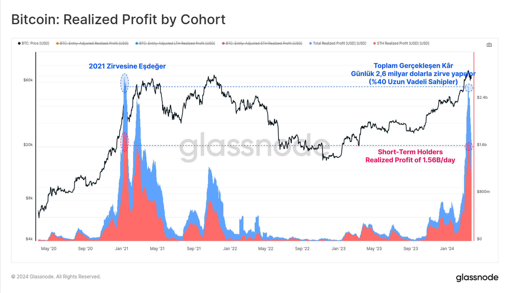 Geriye kalan 1,56 milyar $'lık Gerçekleşmiş kâr, tüccarların akan likidite ve piyasa momentumundan faydalanmasıyla Kısa Vadeli Yatırımcılar tarafından elde edildi. Her iki kategori tarafından elde edilen gerçekleşmiş kâr, 2021 boğa piyasası zirvesine benzer bir büyüklüğe ulaştı.