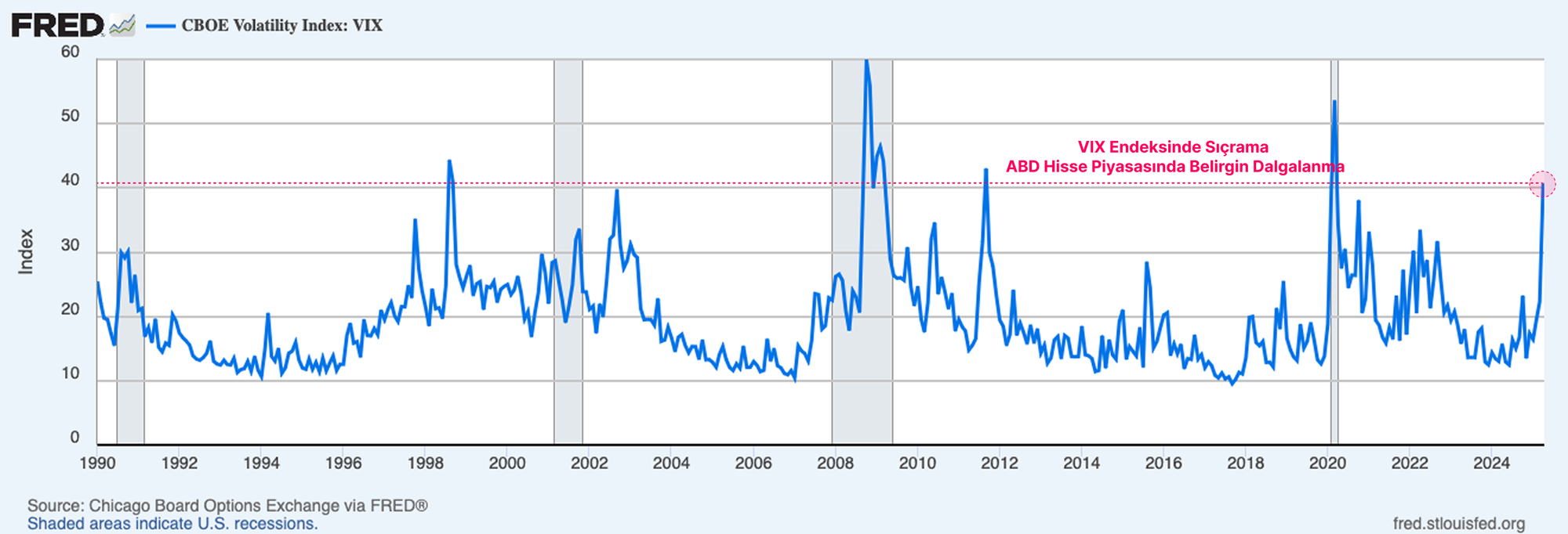 ABD hisse senedi piyasalarındaki düzensizliği, piyasanın ABD borsalarındaki 30 günlük oynaklık beklentisini ölçen VIX Endeksi ile de takip edebiliriz. Tahvil piyasasındaki oynaklık, hisse senedi piyasalarında da kendini göstermiş olup VIX Endeksi şu anda 2020 COVID krizi, 2008 Küresel Finansal Kriz ve 2001 Dot Com Balonu dönemlerindeki oynaklık seviyelerine ulaşmış durumda.
