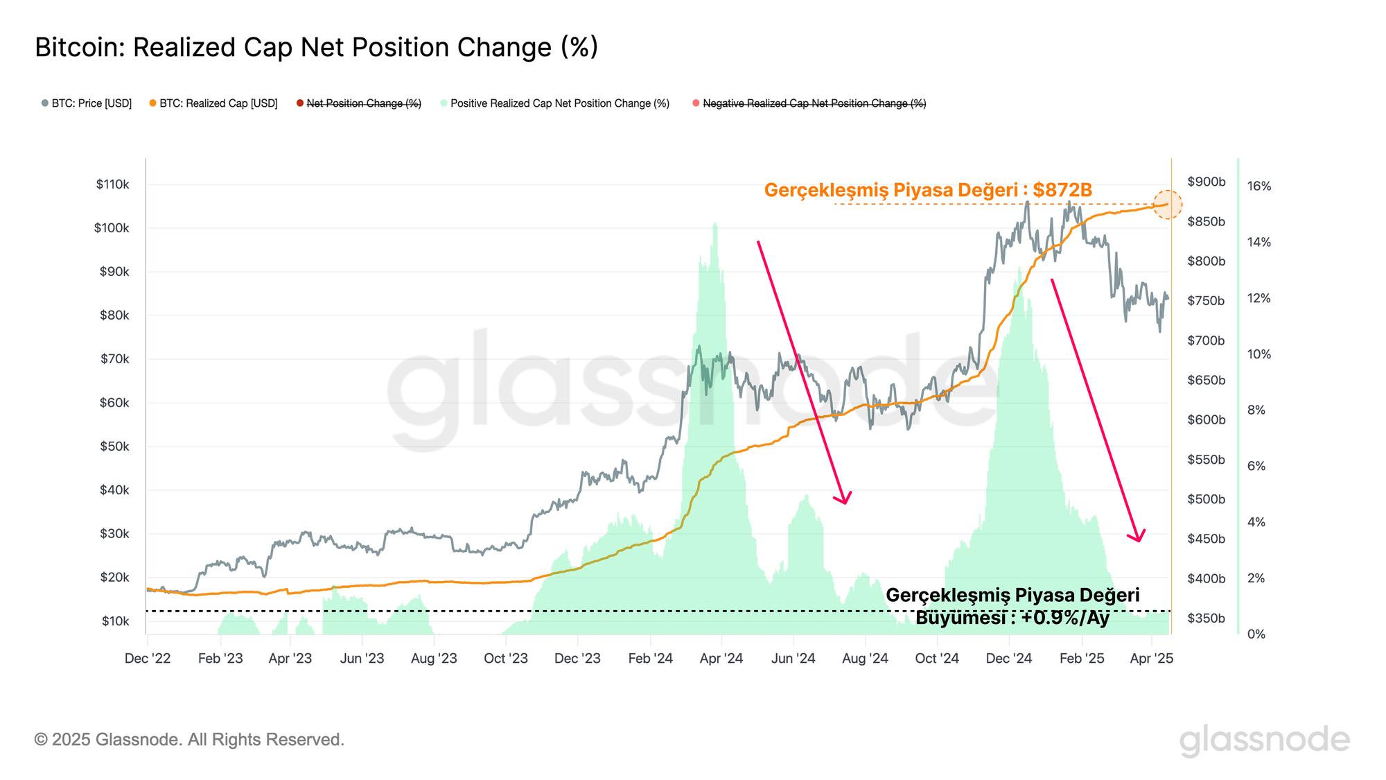 Bitcoin'in iç likiditesini ölçmenin bir yolu, gerçekleşmiş piyasa değeri (realized cap) metriğidir. Bu metrik, dijital bir varlığa yönelik net sermaye girişlerinin kümülatif akışını hesaplar. Gerçekleşmiş piyasa değeri 872 milyar $ ile tüm zamanların en yüksek seviyesinde işlem görmektedir. Ancak, sermaye büyüme hızı aylık sadece %0,9'a sıkışmış durumda.