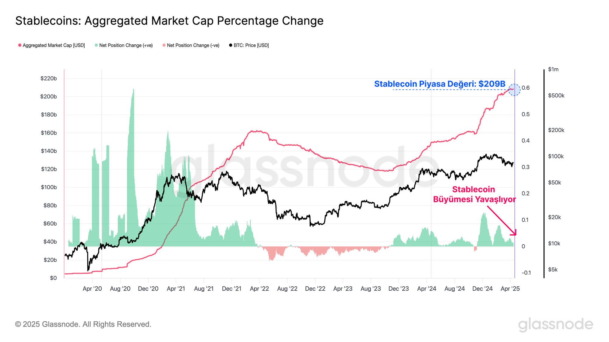 Stablecoin arzındaki büyüme pozitif olmaya devam etmekle birlikte, son haftalarda yavaşlama göstermektedir. Bu durum, dijital dolara olan talebin zayıflamasıyla ölçülen daha geniş dijital varlık likiditesindeki daralmaya ek bir kanıt teşkil etmektedir.