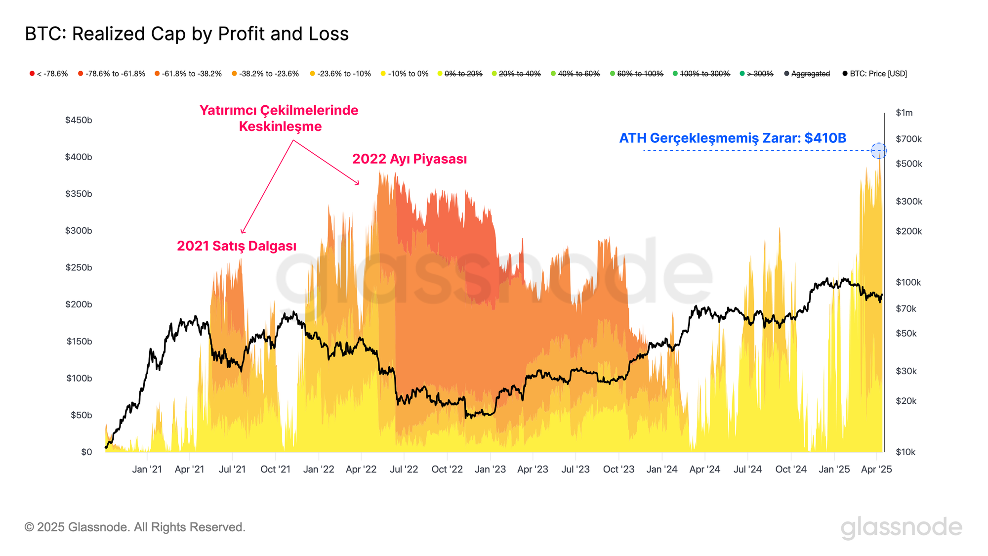 Zarardaki Gerçekleşmiş Piyasa Değeri tüm zamanların en yüksek seviyesine ulaşmış olsa da, dolaşımdaki arzın kârlı pozisyonda olan kısmı %75 gibi yüksek bir seviyede kalmaya devam ediyor. Bu durum, zarardaki yatırımcıların çoğunluğunun tepe oluşum sürecinde yeni alıcılar olduğunu gösteriyor.