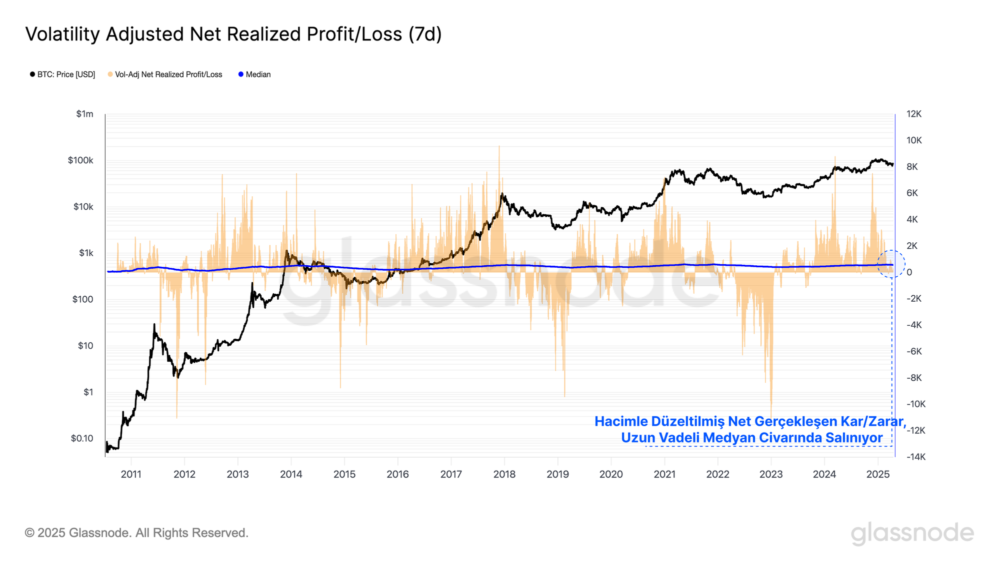 Piyasalar genellikle yatırımcıları maksimum acı noktasına sürükler ve bu durum tipik olarak boğa-ayı döngüsü geçiş noktasında zirve yapar. Oynaklıkla düzeltilmiş Net Gerçekleşen Kar/Zarar'ın uzun vadeli medyan etrafında salınım yaptığını ve bir ortalama geri dönüş (mean reversion) aracı olarak hareket ettiğini gözlemleyebiliriz.