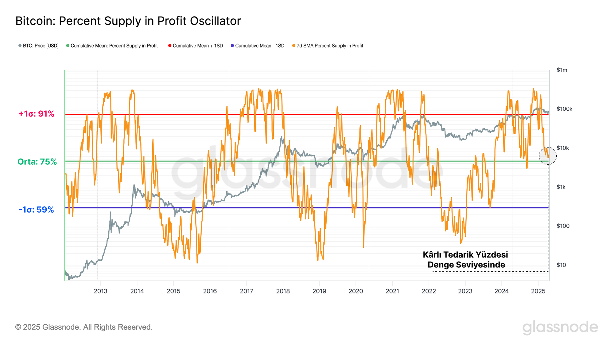 Dikkat çekici bir şekilde, kârlı arz yüzdesi uzun vadeli ortalamasına yaklaşıyor. Tarihsel olarak bu seviye, coinlerin büyük çoğunluğunun zarara girmeden önce savunulması gereken kritik bir alanı ve boğa/ayı piyasası yapıları arasındaki eşiği temsil eder.