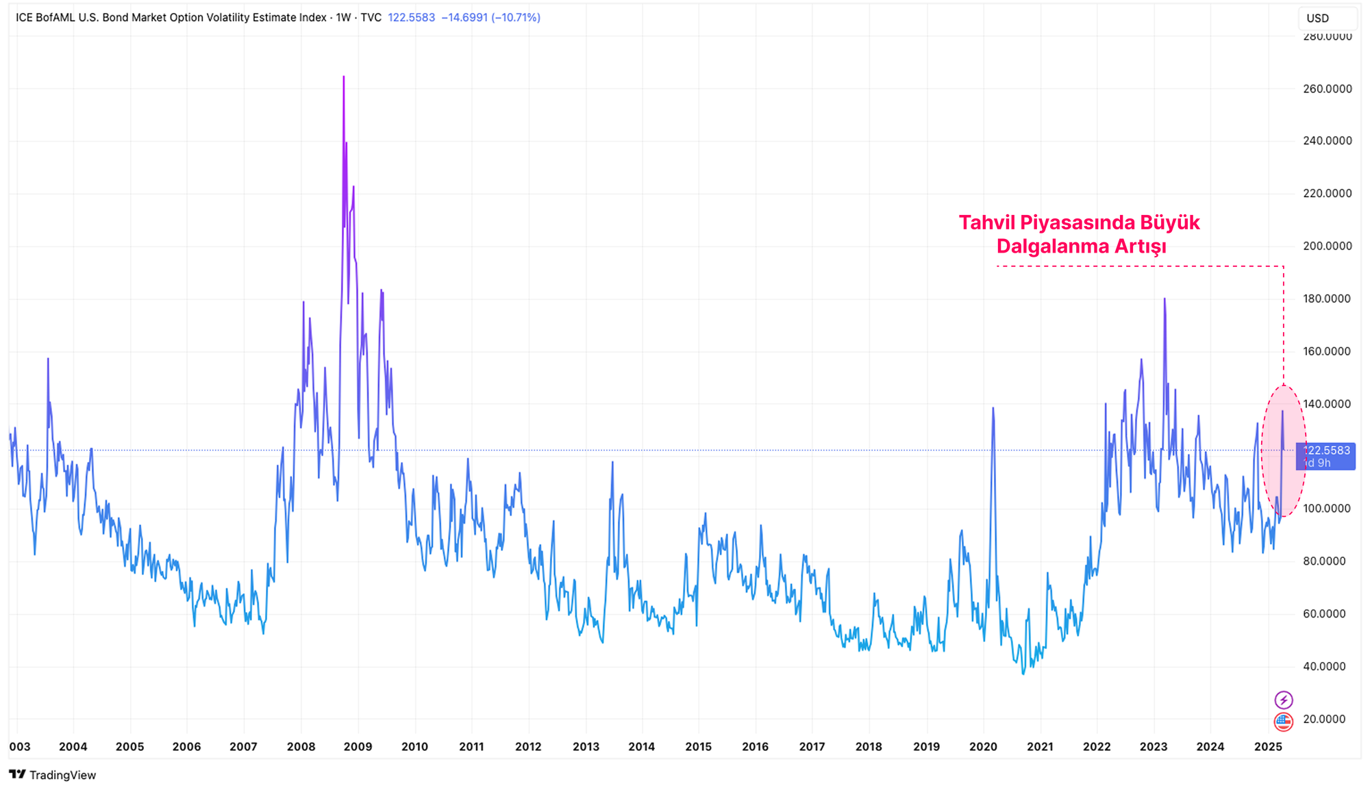 Bu ölçüte göre, ABD Hazine bonolarındaki oynaklık önemli ölçüde arttı ve tahvil piyasası yatırımcıları arasındaki aşırı belirsizlik ve korku düzeyini vurgulamaktadır.