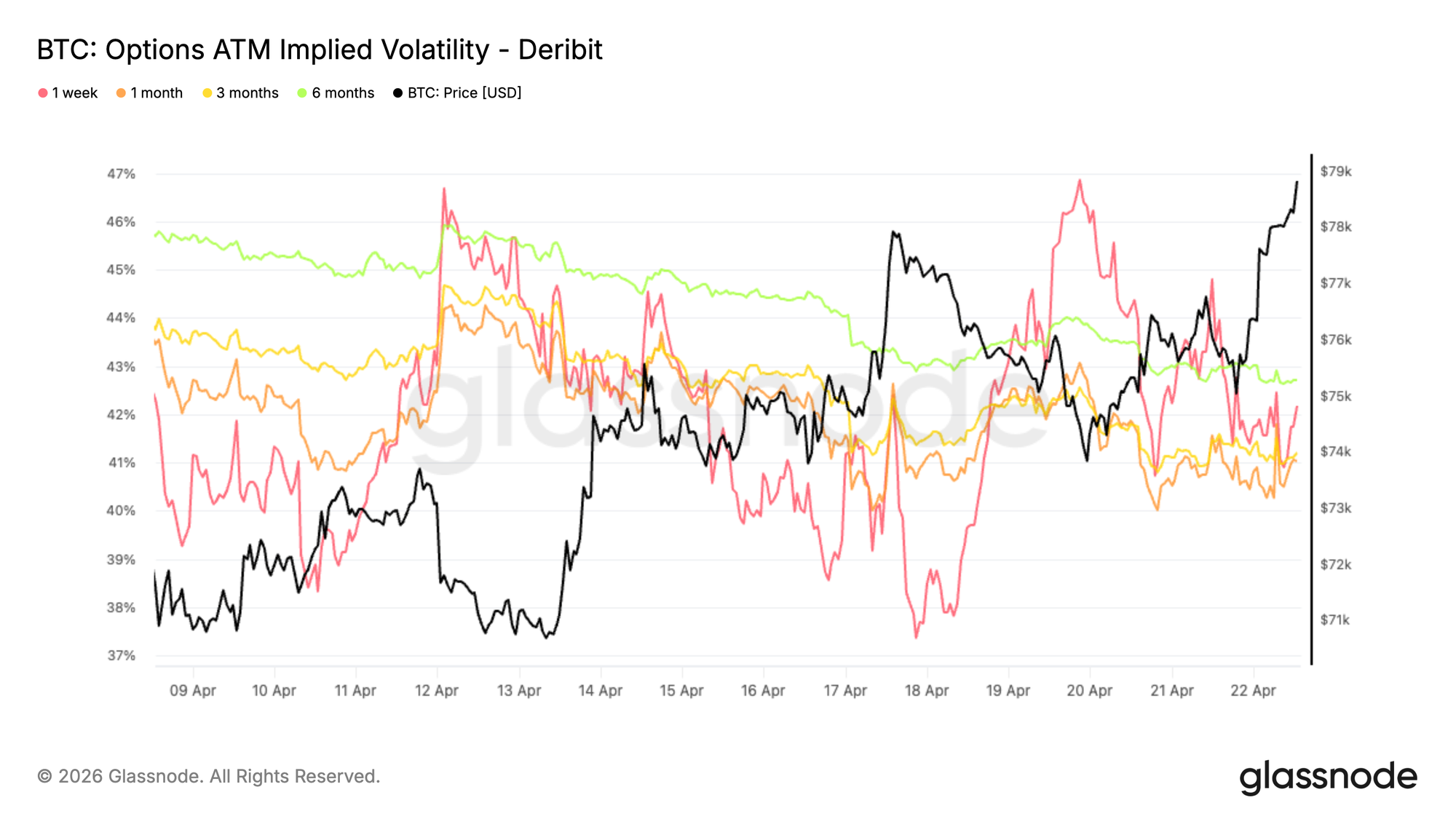Bitcoin'in 30 günlük gerçekleşmiş oynaklık şu anda %40,7 seviyesinde bulunuyor. Nisan başındaki %49 seviyesinden düştü. Fiyat hareketi sınırlı kalmaya devam ediyor ve takip eksikliği gösteriyor. Bu önemlidir çünkü realize volatilite, opsiyonların nasıl fiyatlanması gerektiğine temel oluşturur. Gerçekleşme düşük kaldığında, altta yatan piyasada daha yüksek primleri haklı çıkaracak bir stres olmadığı için implied volatilitenin yukarı yönlü bir hareket sürdürmesi zorlaşır.