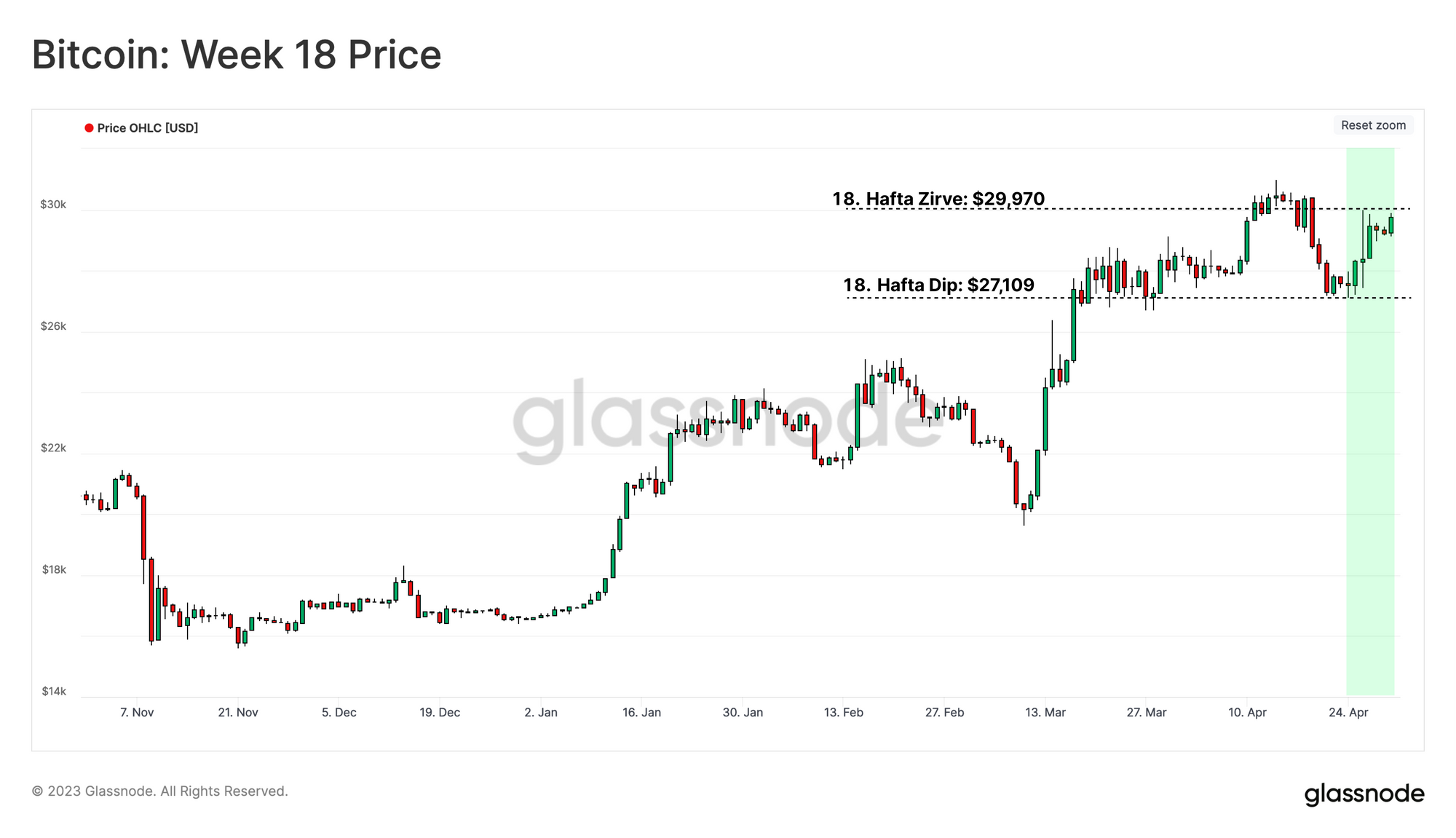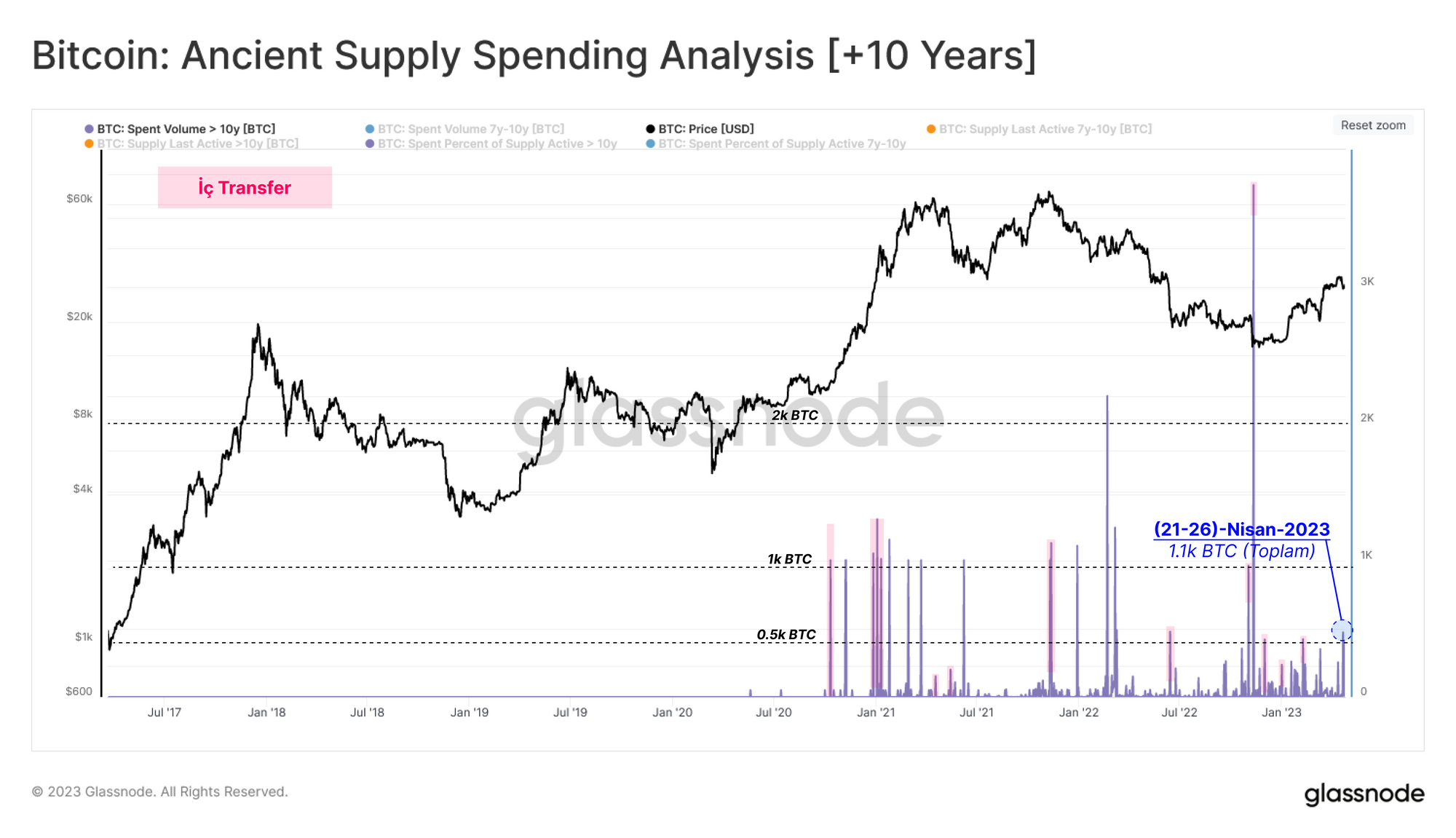 Bitcoin piyasası Mart ortasından bu yana 27 bin ila 30 bin dolar aralığındaki yüksek/düşük bantların her ikisini de test ediyor ve bu hafta 27,1 bin dolardan 29,9 bin dolara yükseldi. Bu ralli sırasında, Mt. Gox ve ABD Hükümeti kontrolündeki cüzdanlardaki hareketlere ilişkin yanlış söylentiler yayıldı. Ayrıca, eski arz sahiplerinin (>7 yıl) bazı faaliyetlerini gördük ve bu da düşük likidite ortamında 1,5 k$ gölgesinde ünlü bir günlük Doji mumunun görülmesine neden oldu.