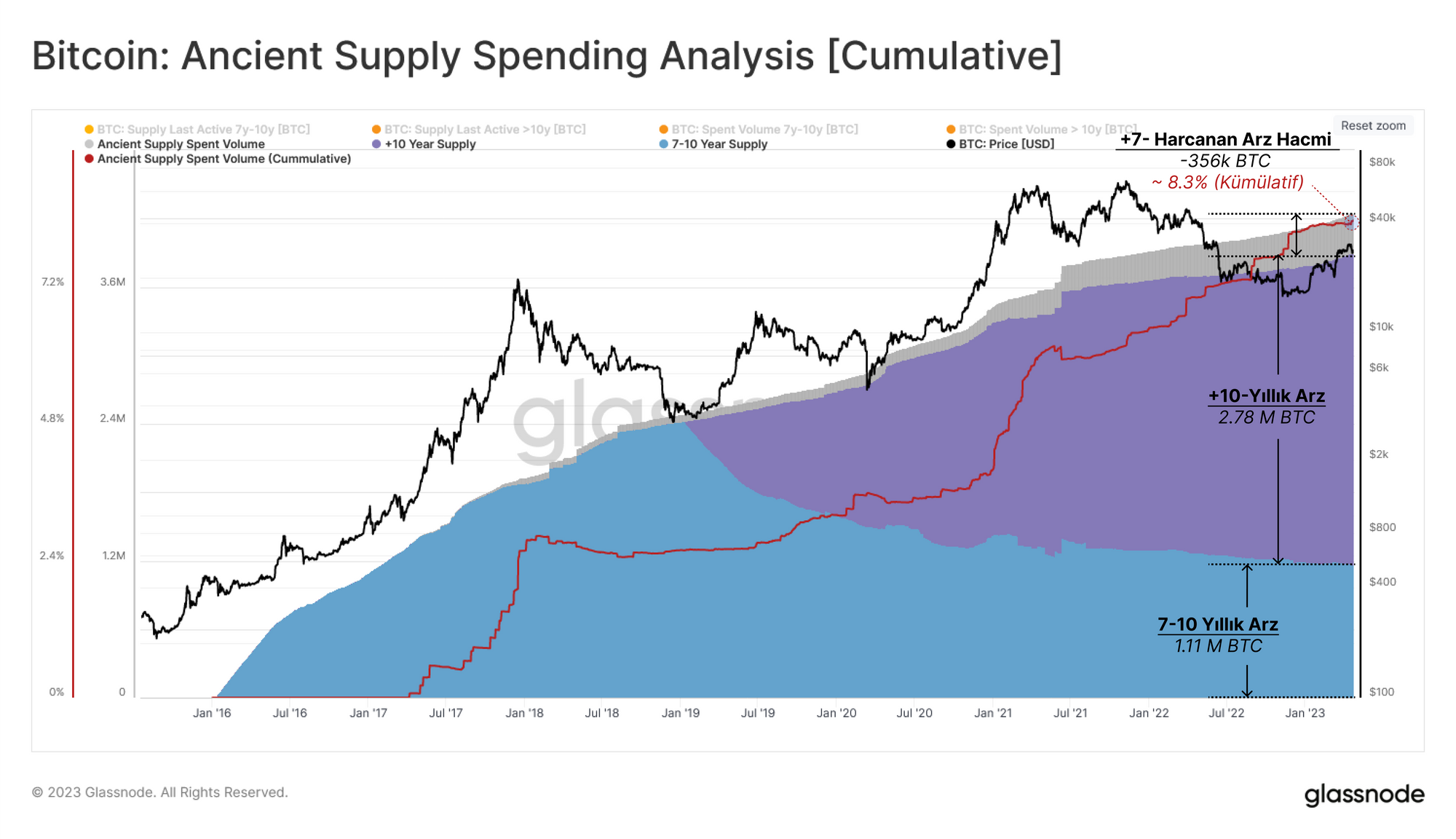 Eski Arz harcamalarına ilişkin geniş bir perspektiften baktığımızda, Bitcoin'in başlangıcından bu yana yalnızca 4,25 milyon coinin Eski Arz (7+ Yıl) statüsüne ulaştığını görebiliriz. Dikkate değer bir şekilde, bu eski coinlerin yalnızca 356 bini harcanmıştır ve bu da tüm zamanların toplamının %8,3'üne denk gelmektedir. Geriye kalan 3,9 milyon (dolaşımdaki arzın %20'si) hareketsiz kalmakta ve genellikle kaybolduğu varsayılmaktadır.
