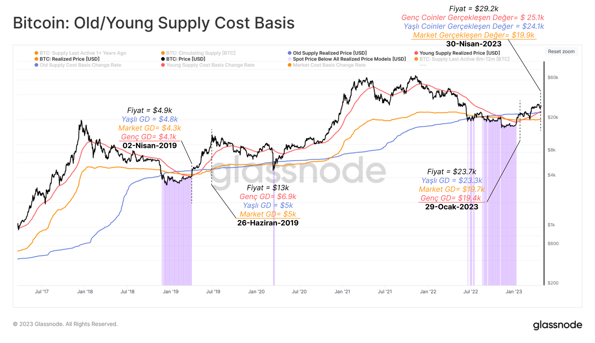 Aşağıdaki grafik, bu Genç/Eski Arz gruplarının ortalama maliyet bazını piyasa ortalamasıyla birlikte göstermektedir.