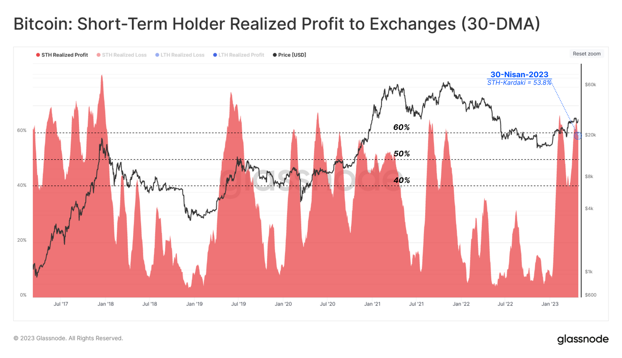 Borsalara coin gönderen hem Uzun Vadeli 🟦 hem de Kısa Vadeli 🟥 Sahip grupları arasında, Kısa Vadeli Sahiplerin hakimiyeti toplam girişlerin %90-95'i gibi istikrarlı bir oranda kalmaktadır. Daha koyu kırmızı bölge ile gösterilen ve şu anda borsa girişlerinin %58'ini oluşturan STH'lerin 2023'te kâr elde etme oranlarındaki artış oldukça dikkat çekicidir.