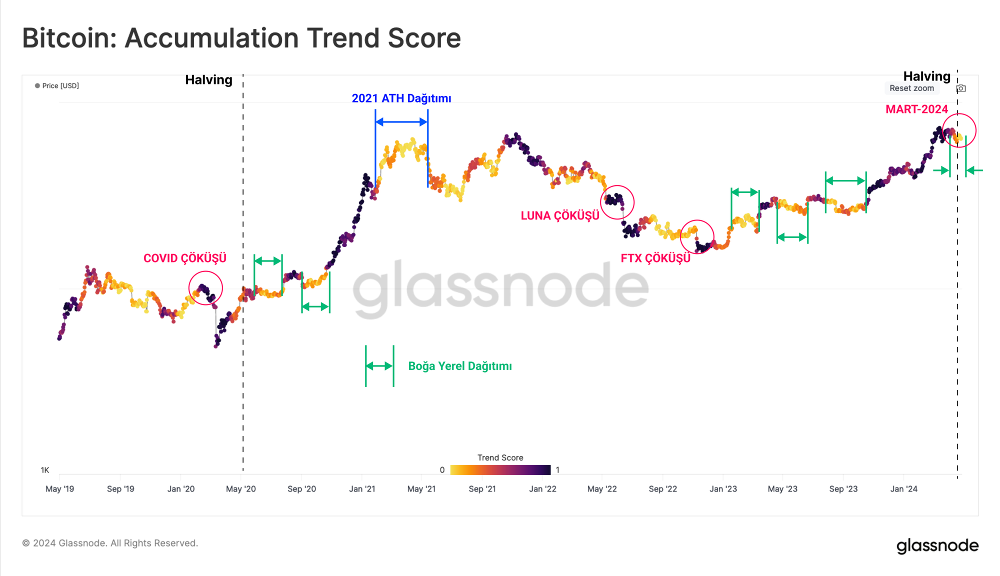 - Mart ayındaki 73 bin $'lık ATH'den bu yana Bitcoin piyasası, coinlerin likidite ve akan talepten faydalanmasıyla yaygın net dağıtıma geçti.