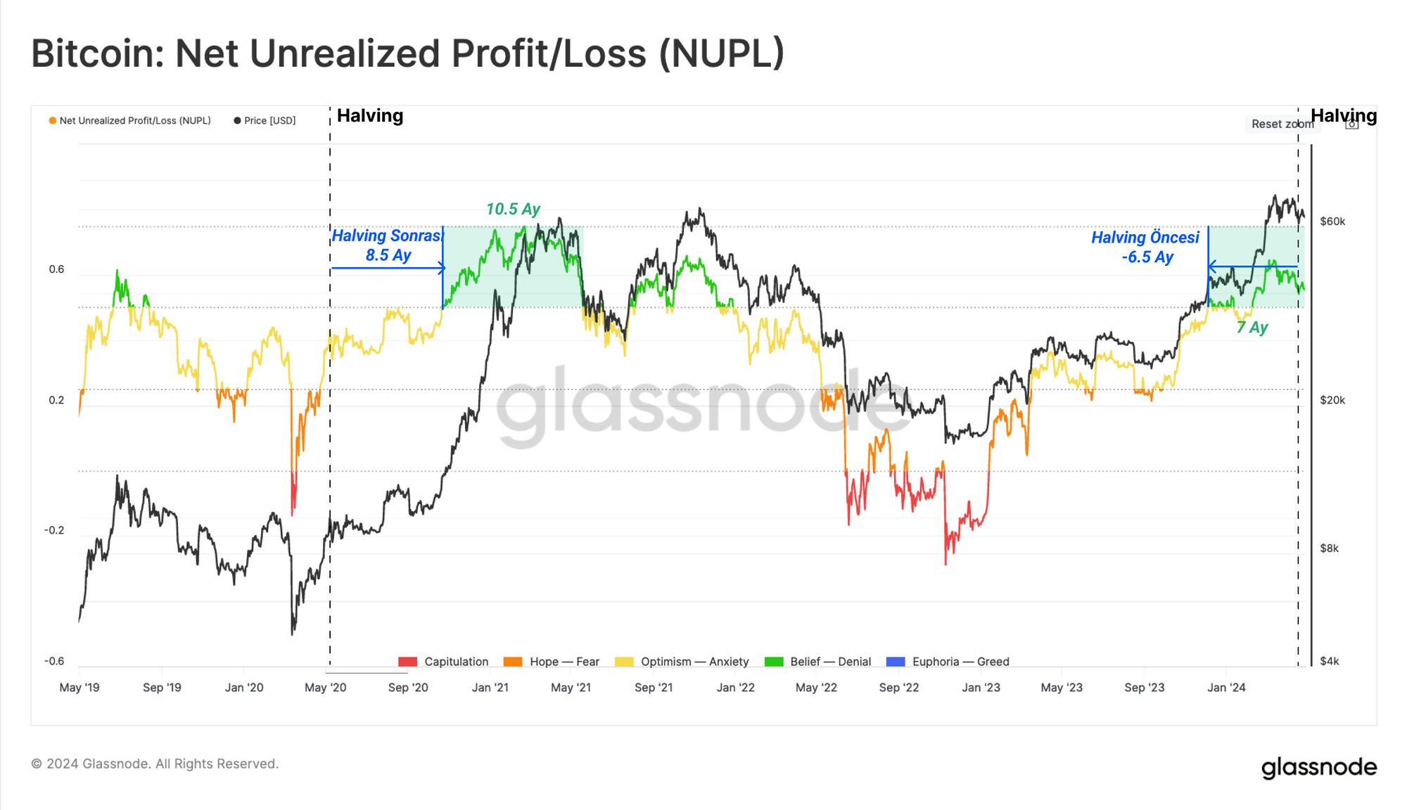 2020-21 döngüsünde, bu aşama Bitcoin'in yarılanmasından 8,5 ay sonra tetiklendi ve sonrasında neredeyse 10,5 ay boyunca yukarı yönlü devam etti. Ancak bu döngüde NUPL, yarılanmadan yaklaşık 6,5 ay önce 0,5 seviyesini aşmıştır. Bu belirgin değişim, piyasaya güçlü bir talep getirerek fiyat hareketini şekillendirmede ve hızlandırmada ABD ETF'sinin önemini vurgulamaktadır.