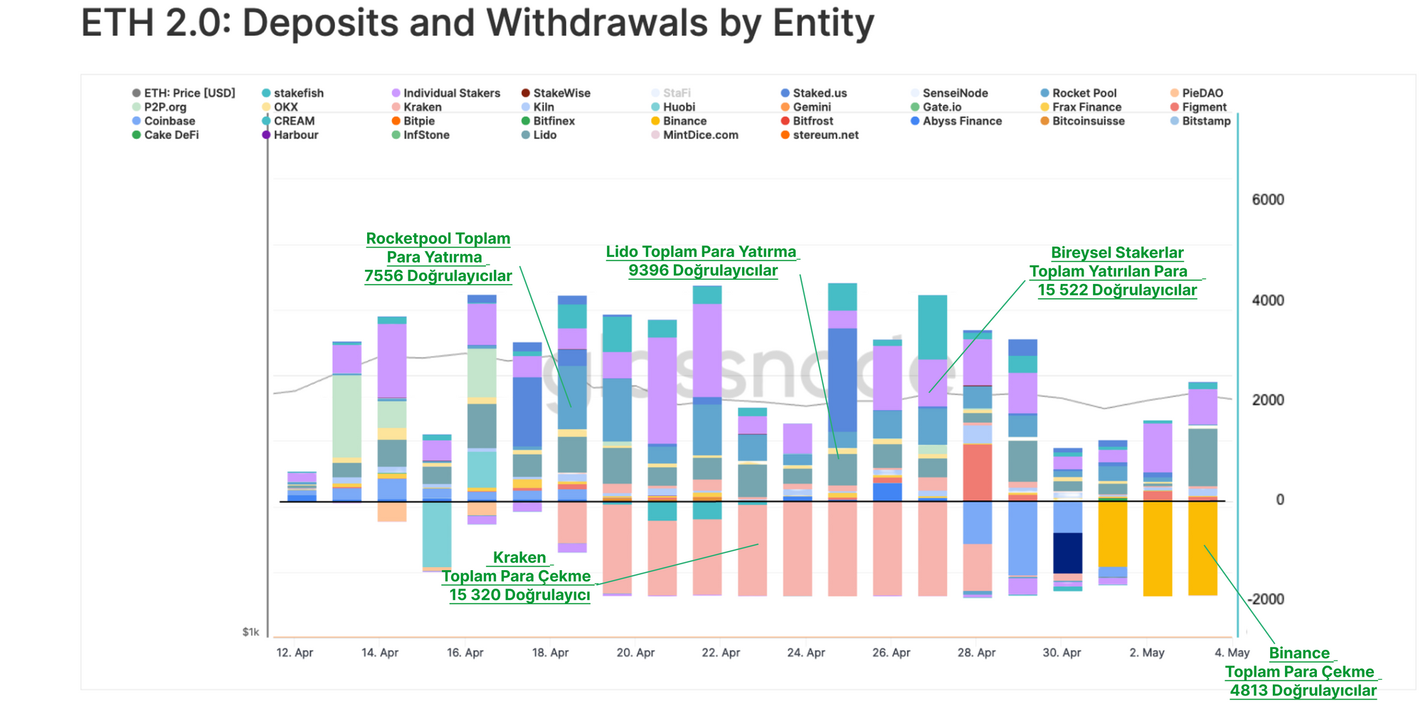 Beklenmedik bir şekilde, çok sayıda para yatırma işlemi (15.522 doğrulayıcı) bireysel stakerlar tarafından yapılmıştır. Bu durum, bu grubun büyük etkinlikler sırasında daha aktif olma eğiliminde olduğuna dair önceki bulgularımızı desteklemektedir. Ayrıca, Lido'dan sürekli bir para yatırma akışı gözlemliyoruz ve bu da likit stake türevi tokenlara yönelik talebin devam ettiğini gösteriyor.