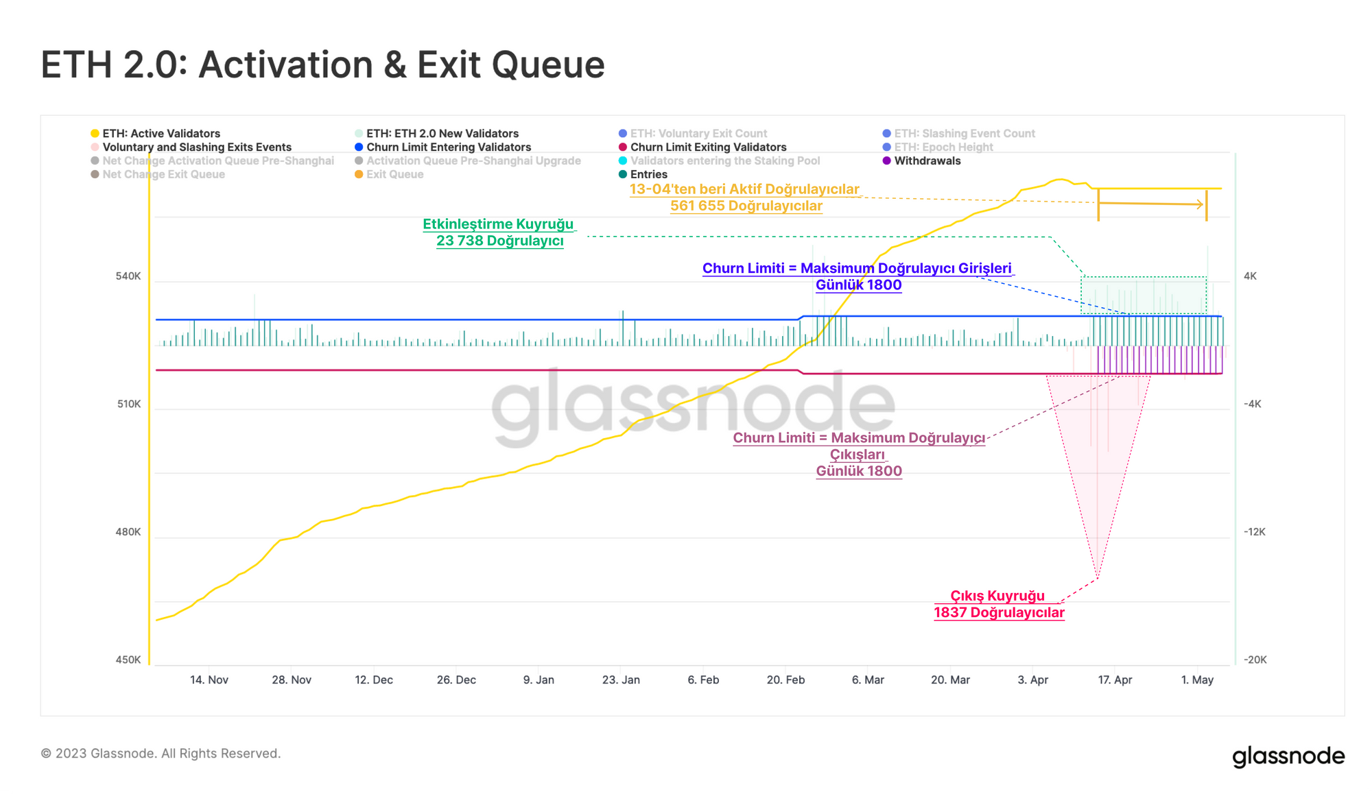Denklemin diğer tarafında, 23.000'den fazla doğrulayıcının giriş aktivasyon kuyruğunda beklediğini, çıkış kuyruğunun ise sadece 1.837'ye düştüğünü görüyoruz. İki farklı kuyruğu gözlemleyerek, çıkış olaylarının yeni stake ler ile dengelendiğini ve bunun da aktif doğrulayıcı sayısında sıfır değişiklikle sonuçlandığını görüyoruz.
