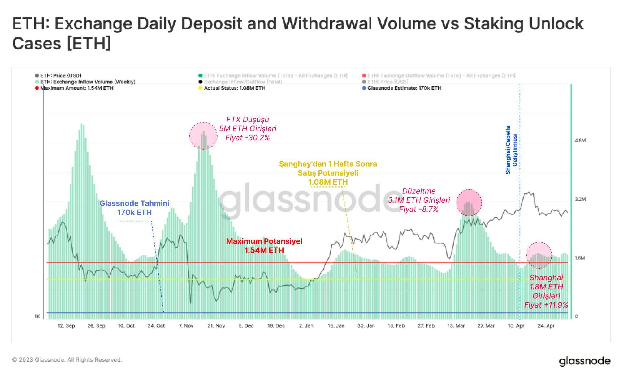 Bu haftaki sayımızda, 170 bin ETH civarında olduğunu tahmin ettiğimiz gerçek satış tarafı baskısının derecesini ölçmeye çalıştığımız Şangay öncesi raporumuzu takip edeceğiz. Bu raporda, para çekme, para yatırma ve bunları başlatan kuruluşların bakiyesine odaklanarak, yükseltmeden bu yana gerçekte neler olduğunu değerlendireceğiz.