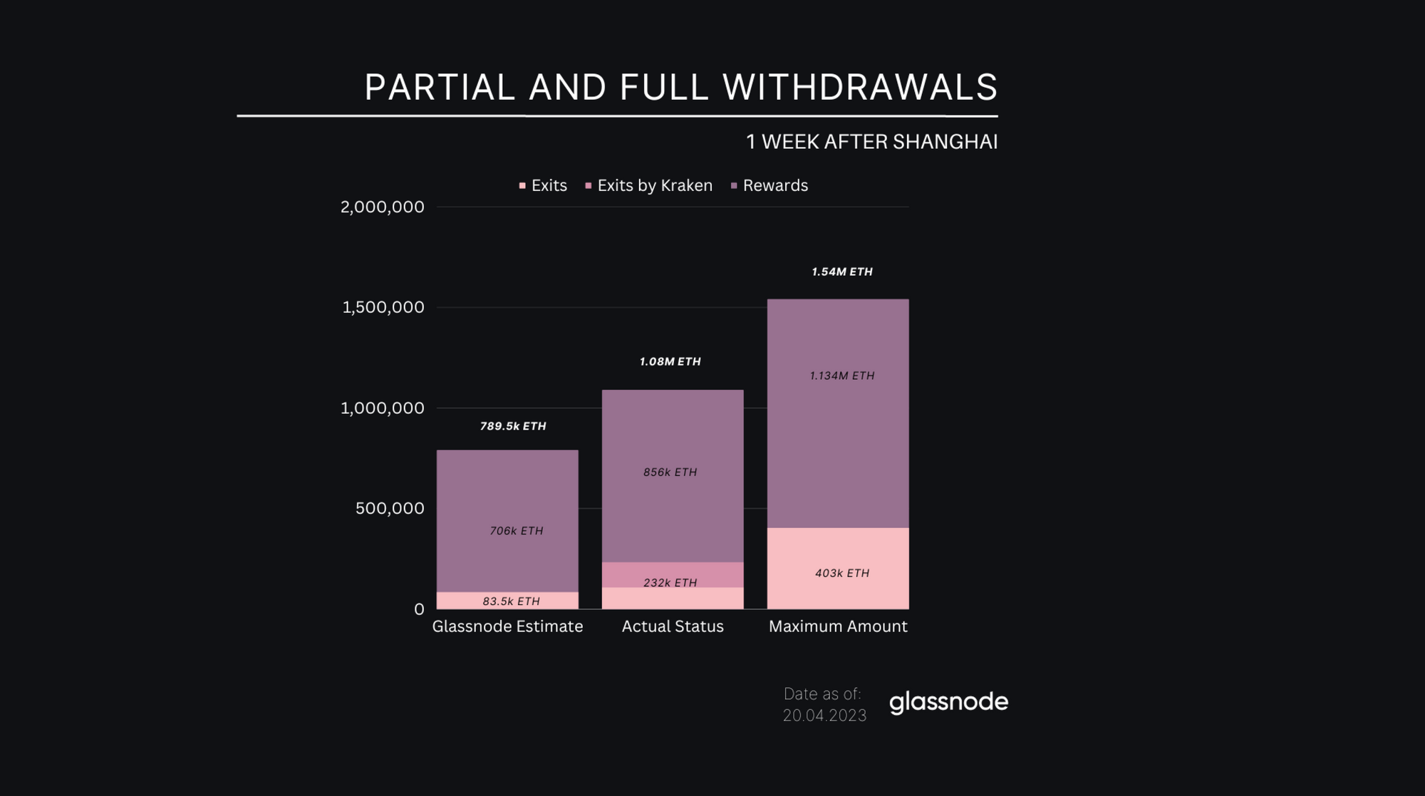 Gerçek rakamlar tahminimiz ile mümkün olan maksimum miktar arasındadır. İlk hafta boyunca 856 bin ETH ödül ve toplam 232 bin ETH stake edilmemiştir. Kısmi para çekme işlemleri, serbest bırakılan toplam ETH miktarının %80'ini oluşturmuştur.