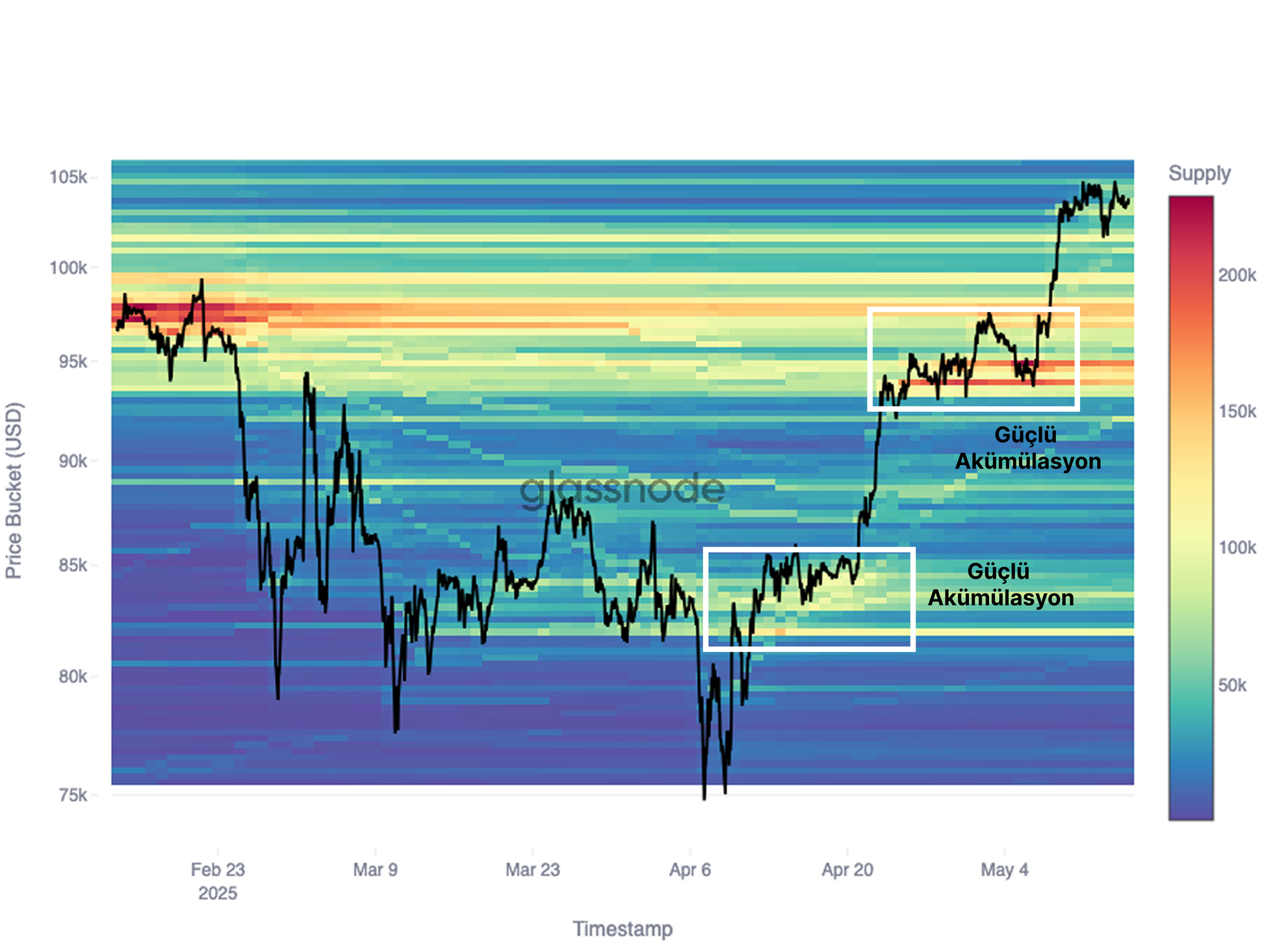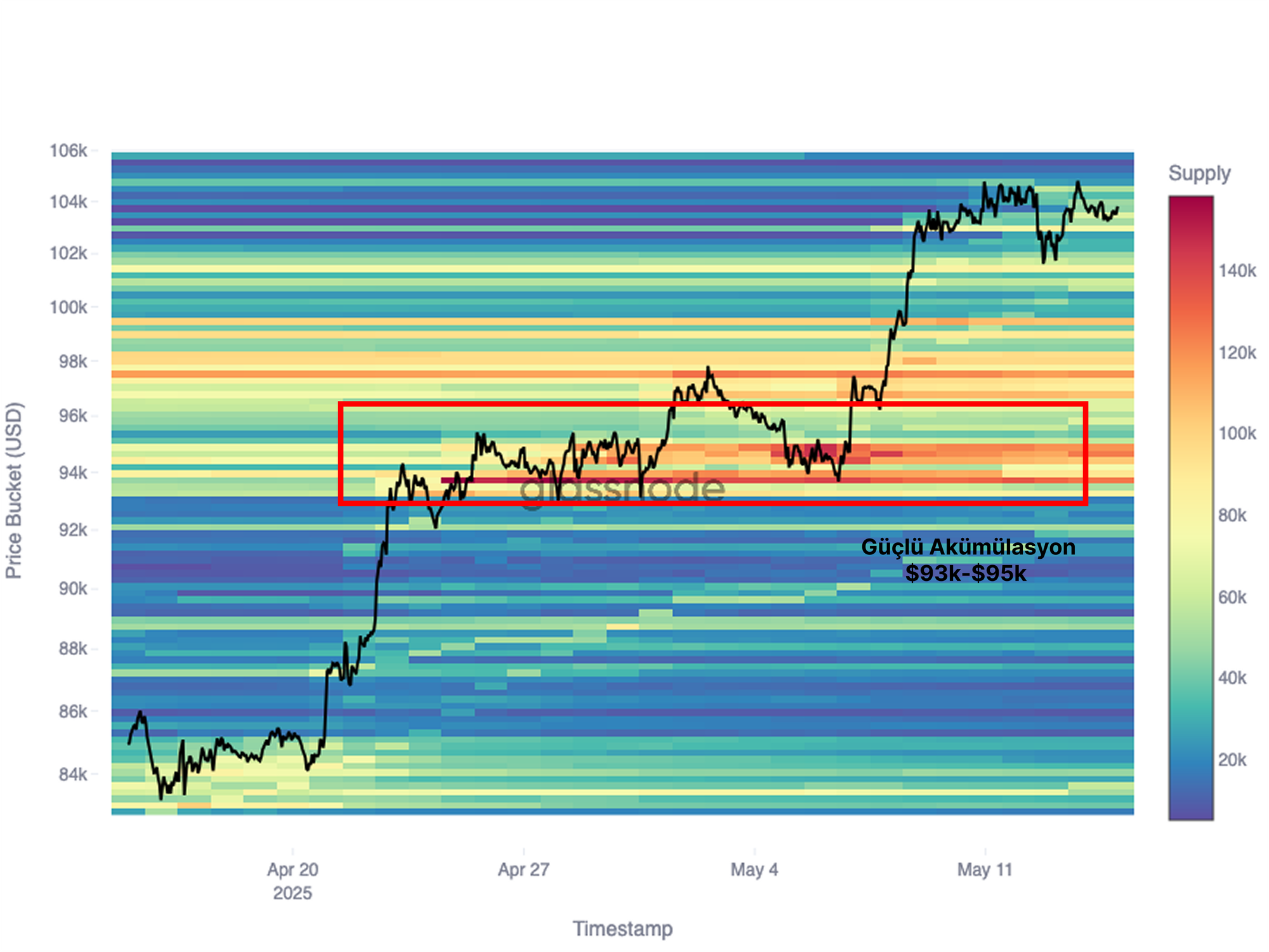 Buradan, her yükseliş aşamasından önce oluşan birikim rejimlerini ve nihayetinde 104 bin dolara ulaşan son hareketi net bir şekilde tespit edebiliriz.