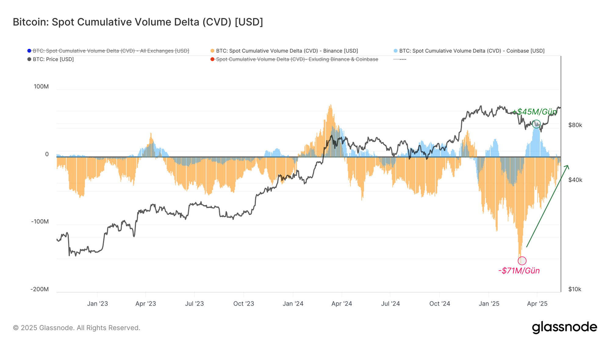 Bu zincir içi sinyallere ek olarak, zincir dışı emir akış metrikleri de piyasa sentimi ve eğilimi hakkında değerli bilgiler sunmaktadır. Bunlardan biri olan Spot Kümülatif Hacim Deltası (CVD), spot emir defterlerindeki net alıcı tarafı baskısını takip eder. Başlıca borsalardaki bu metriği inceleyerek spot piyasalardaki güç ve yönelim eğilimini değerlendirebiliriz.