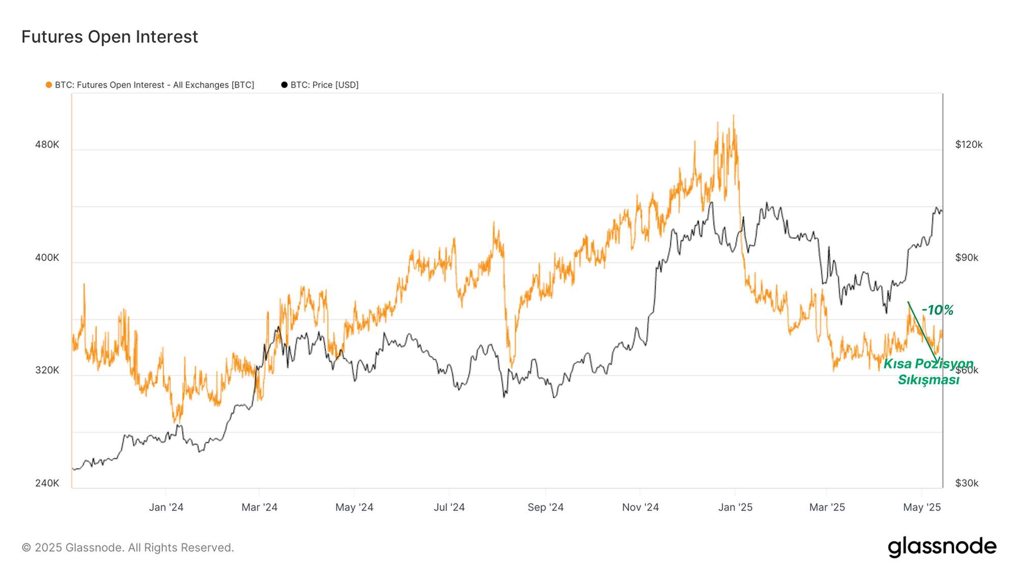 Kaldıraçlı kısa pozisyonların tasfiye edilmesiyle futures açık pozisyon hacmi %10 azalarak 370 bin BTC'den 336 bin BTC'ye geriledi. Bu düşüş, short squeeze'in boyutunu anlamamızı sağlıyor. Bu süreç aynı zamanda sağlıksız bir kaldıraç azaltma olayı olasılığını düşürüyor ve kısa vadeli fiyat hareketlerindeki oynaklık potansiyelini hafifletiyor.