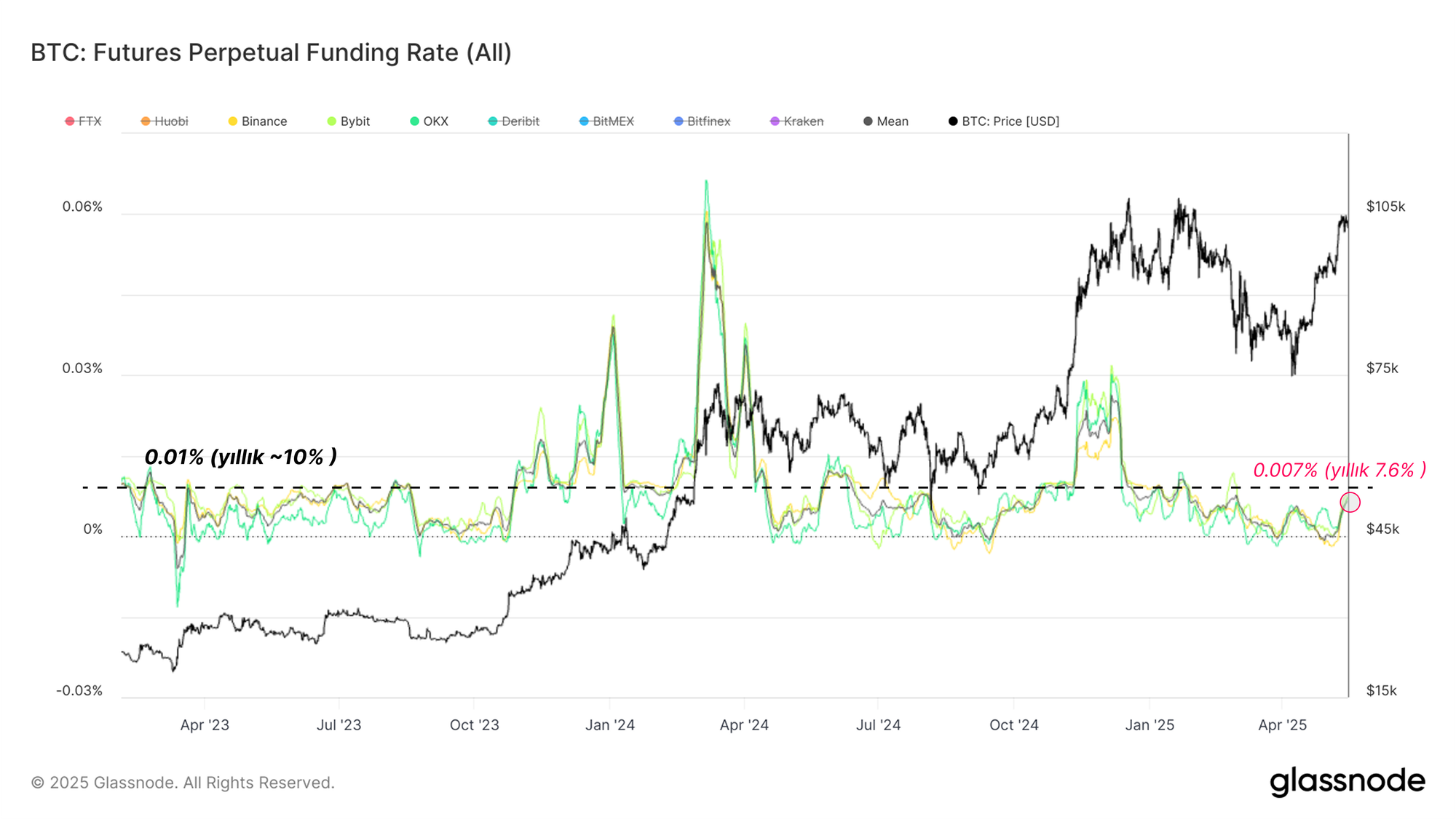 Aşağıdaki grafikte görüldüğü gibi, ortalama ve bireysel fonlama oranları Nisan sonundan bu yana istikrarlı şekilde toparlanarak şu anda yaklaşık %0,007 (yıllık %7,6) seviyelerinde seyrediyor. Bu artış, yapıcı bir değişimi yansıtıyor ve perpetual piyasalarda uzun pozisyon iştahının aşırı olmadığını gösteriyor. Piyasada bu aşamada sınırlı miktarda uzun pozisyon kaldıracı bulunması sağlıklı bir işaret.