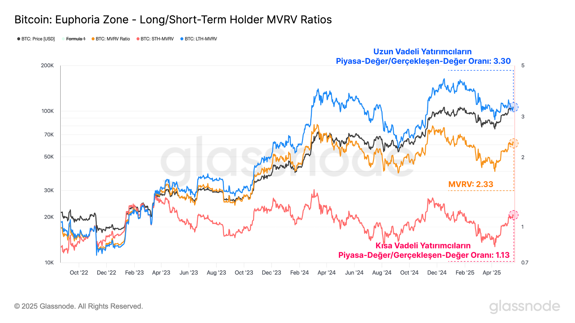 - MVRV, 1.74'ten 2.33'e yükseldi (%74'ten %133'e gerçekleşmemiş kazanç)
