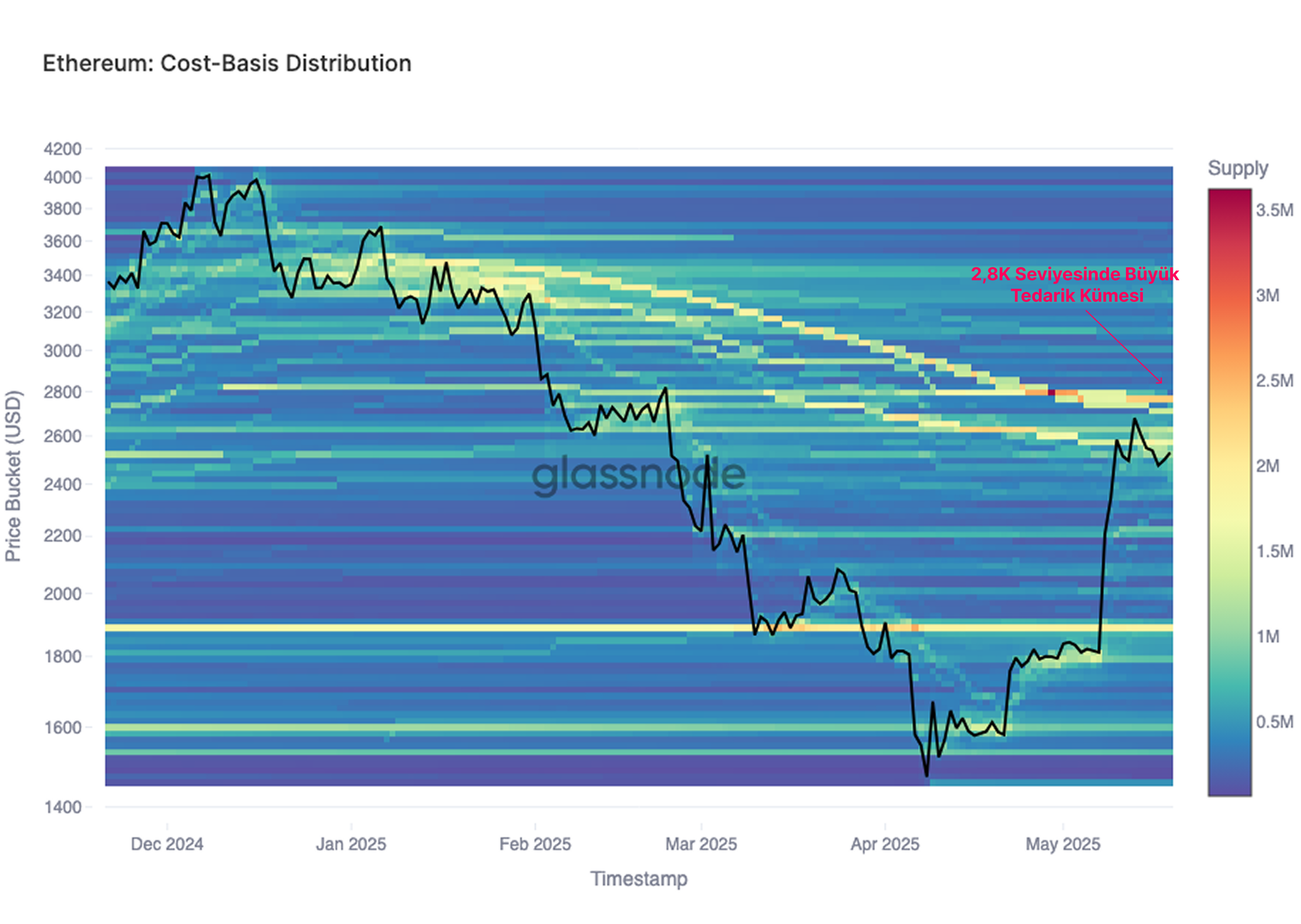 Ethereum'un Maliyet Tabanı Dağılım profili incelendiğinde uyum göze çarpıyor. Şu anda, yatırımcı maliyet tabanı seviyelerinin önemli bir yoğunlaşması 2.800$ seviyesi civarında bulunuyor. Bu bölge, artan satış baskısını çekme potansiyeline sahip, çünkü daha önce zararda olan birçok yatırımcı başa baş seviyesinde veya yakınında riskten kaçınarak pozisyonlarının bir kısmını realize etmek isteyebilir.