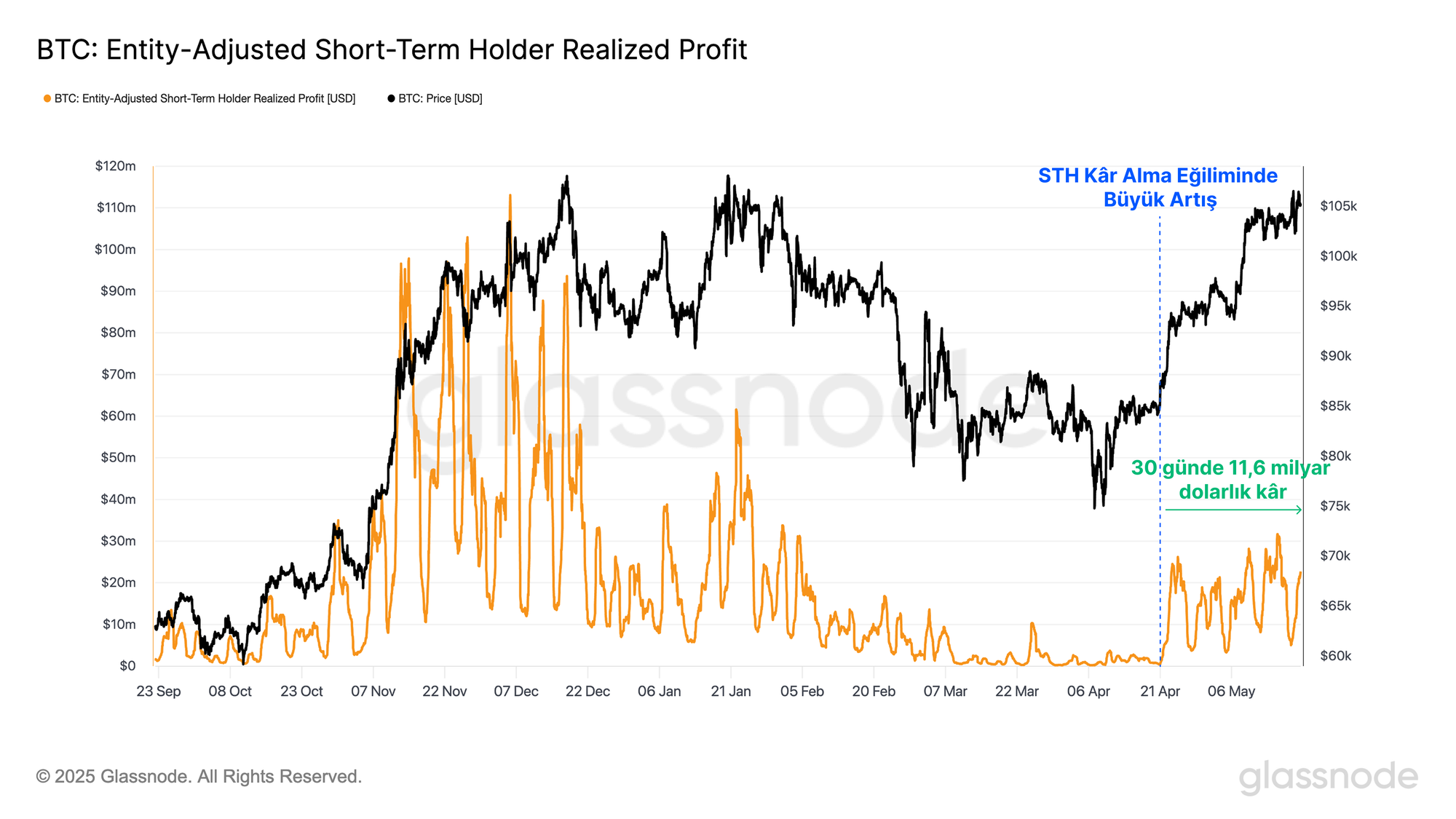 Fiyatın Kısa Vadeli Yatırımcı maliyet tabanı olan 93 bin dolara doğru hızlanması ve ardından bu seviyenin kesin olarak üzerine çıkmasıyla, günlük 747 milyon dolarla zirve yapan belirgin bir kâr realizasyonu hareketliliği gözlemlenmiştir.