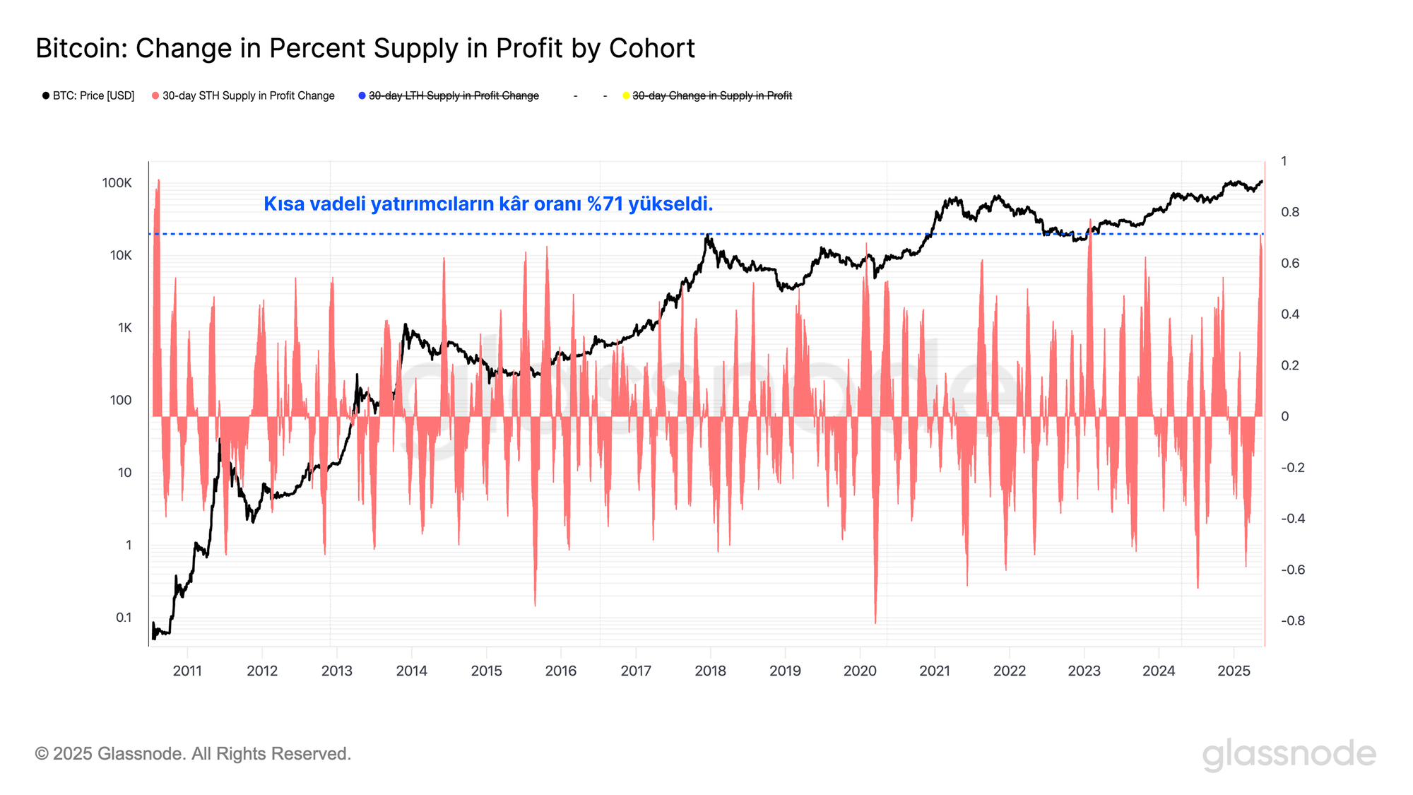 Özellikle kısa vadeli yatırımcılar, son fiyat yükselişiyle önemli bir finansal rahatlama yaşadı. Bu grubun kârlı arz oranı son bir ayda %71 artarak kaydedilen en büyük ikinci olumlu sıçramayı gerçekleştirdi.
