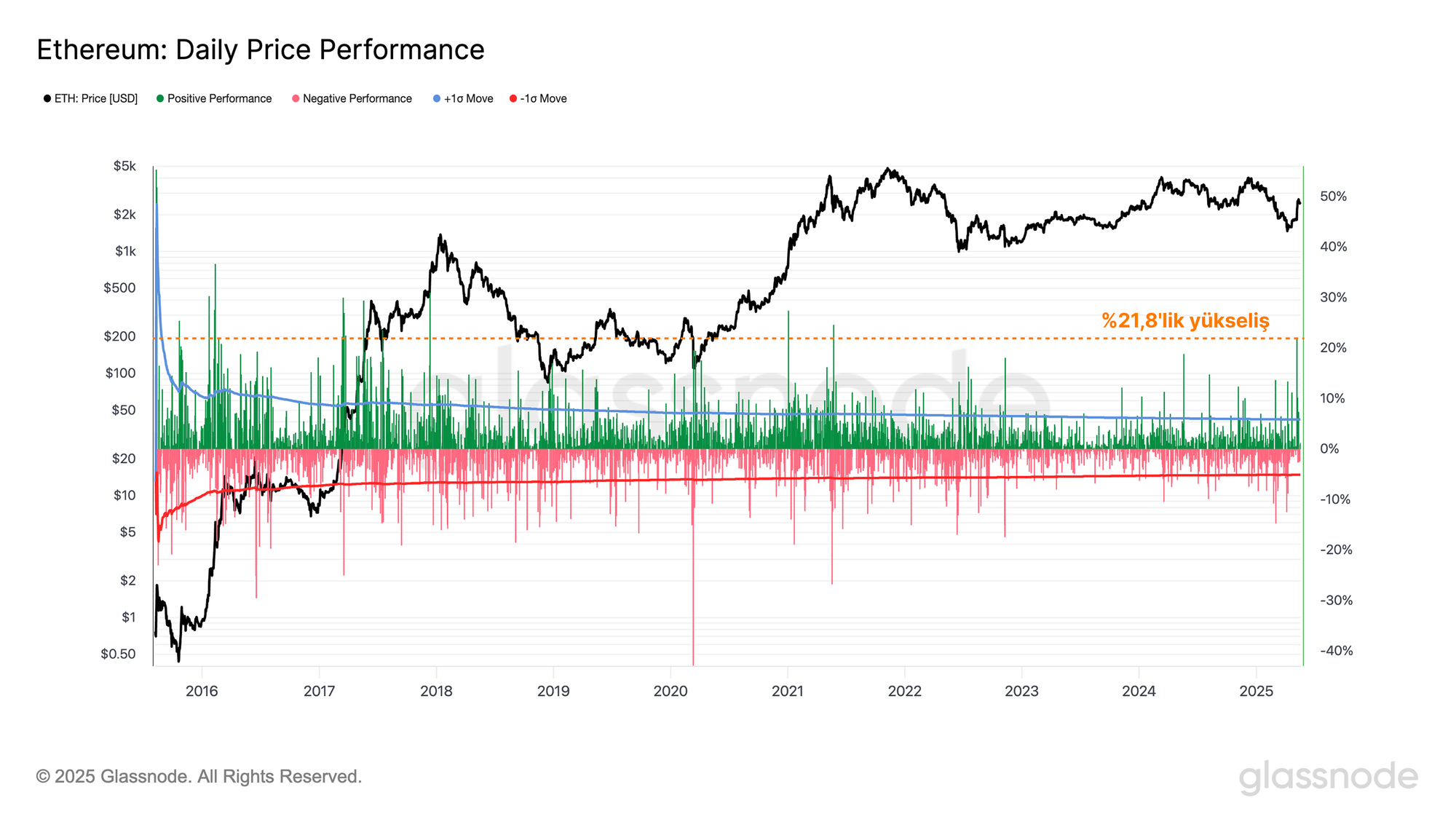 - Ethereum'un fiyatı son haftalarda, 7 Mayıs'taki başarılı Pectra güncellemesiyle ilgili heyecanın da etkisiyle önemli bir yükseliş yaşadı. Bu rallide, günlük fiyat artışları birden fazla kez +1σ hareketlerini aştı ve en belirgin yükseliş Mayıs 2021'den bu yana görülen en güçlü tek günlük artış olan +%21,8'lik sıçramaydı.
