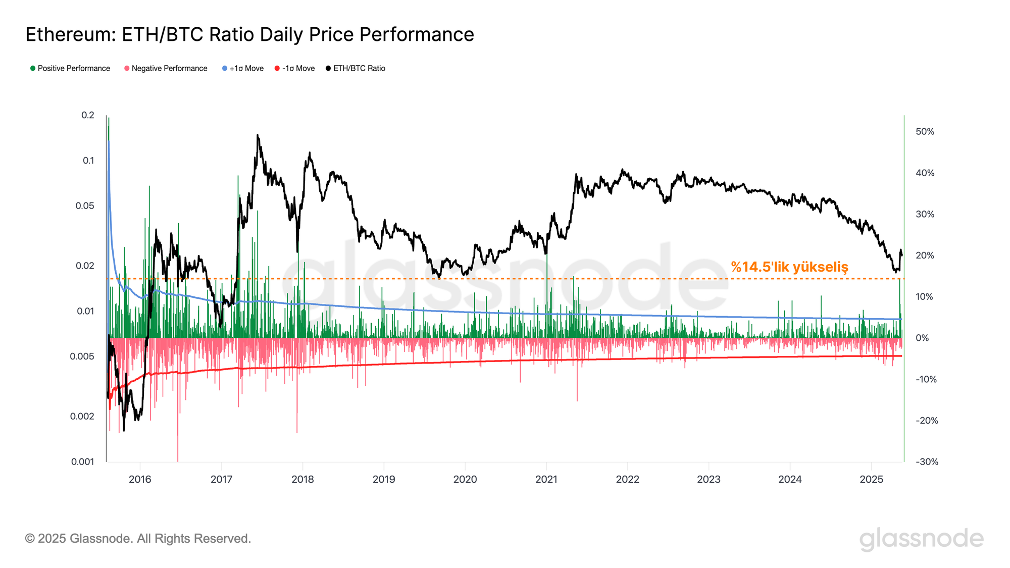 Ethereum'un son dönemdeki güçlü performansı, ETH/BTC oranında bir canlanmaya yol açtı. Oran %14,5 artışla 0,026 seviyesine yükselerek kayıtlardaki 46. en büyük yükseliş olayını gerçekleştirdi.