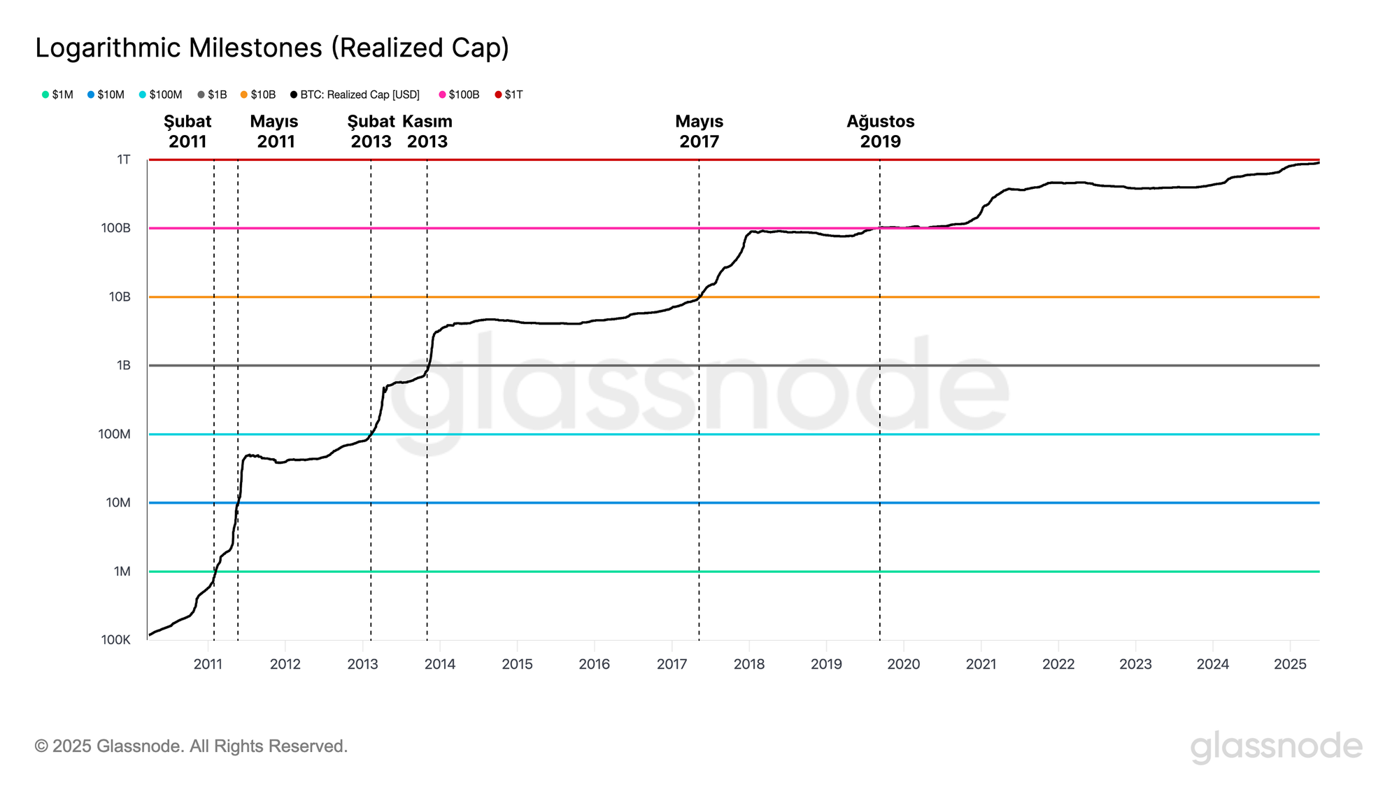 2011-2013 arasında gerçekleşmiş değer 1 milyon dolardan 1 milyar doların üzerine çıkarak 2 yıllık sürede dört logaritmik eşiği aştı. Bitcoin bugünkünden çok daha küçük bir varlıktı ve ağın ilk kuruluş aşamasında üstel büyüme yaşadı. Sonraki büyük eşik olan 10 milyar dolar seviyesine ulaşmak 3.5 yıl gerektirdi ve bu seviye 2017 ortalarında aşıldı.