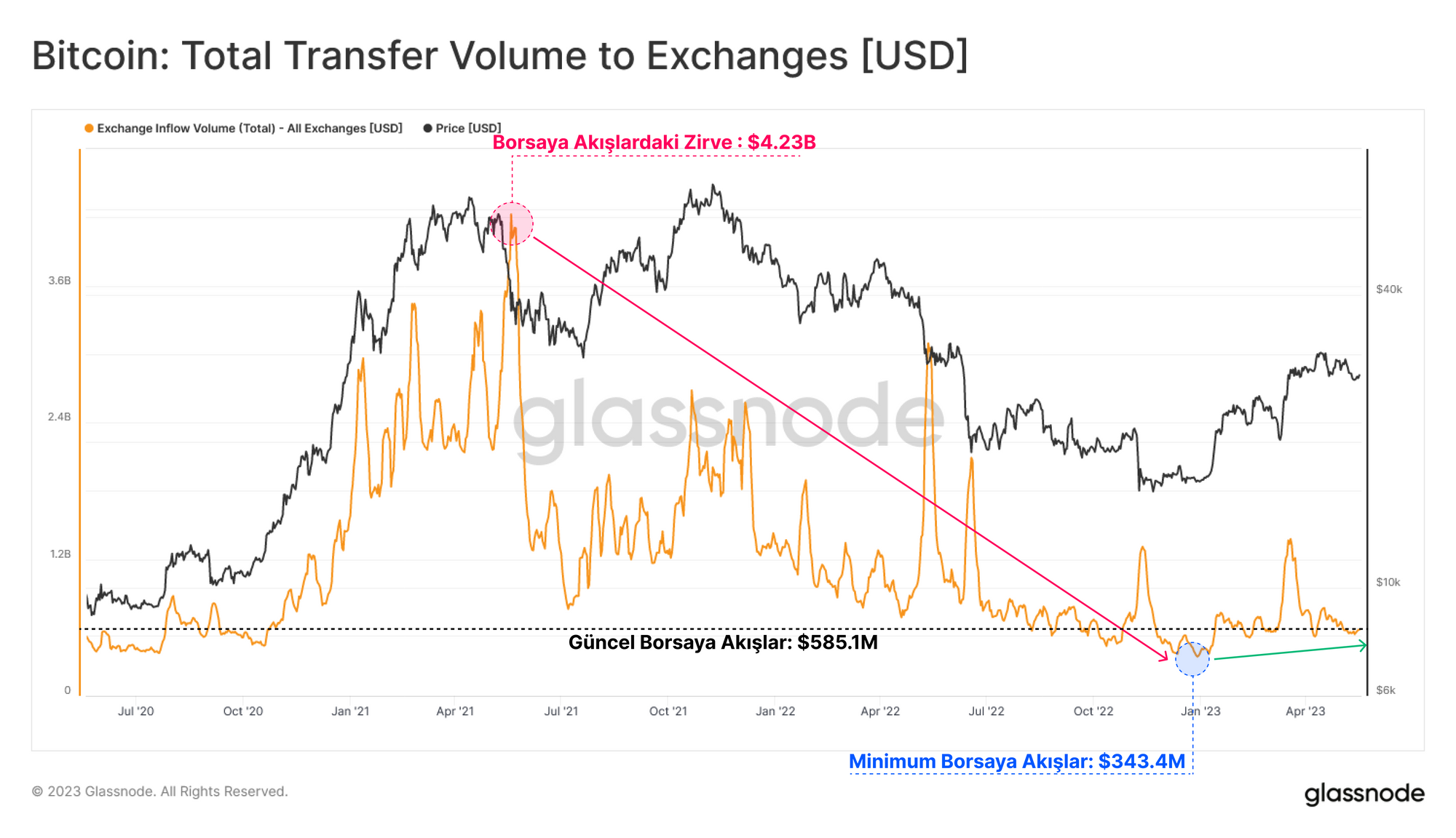 Bitcoin ağı tarafından son üç yılda gerçekleştirilen Transfer Hacmi değerlendirildiğinde, 2021'in başından bu yana genel ekonomik işlem hacminde büyük bir düşüş yaşandığı ve 13,1 milyar $'lık yüksek bir döngüden %85,5'lik bir düşüşle 1,9 milyar $'lık düşük bir döngü seviyesine gerilediği görülmektedir. Transfer hacimleri 2023'te sınırlı bir artış yaşadı, ancak 1,9 milyar dolar ile 4,4 milyar dolar arasında döngünün en düşük seviyelerine yakın kaldı.
